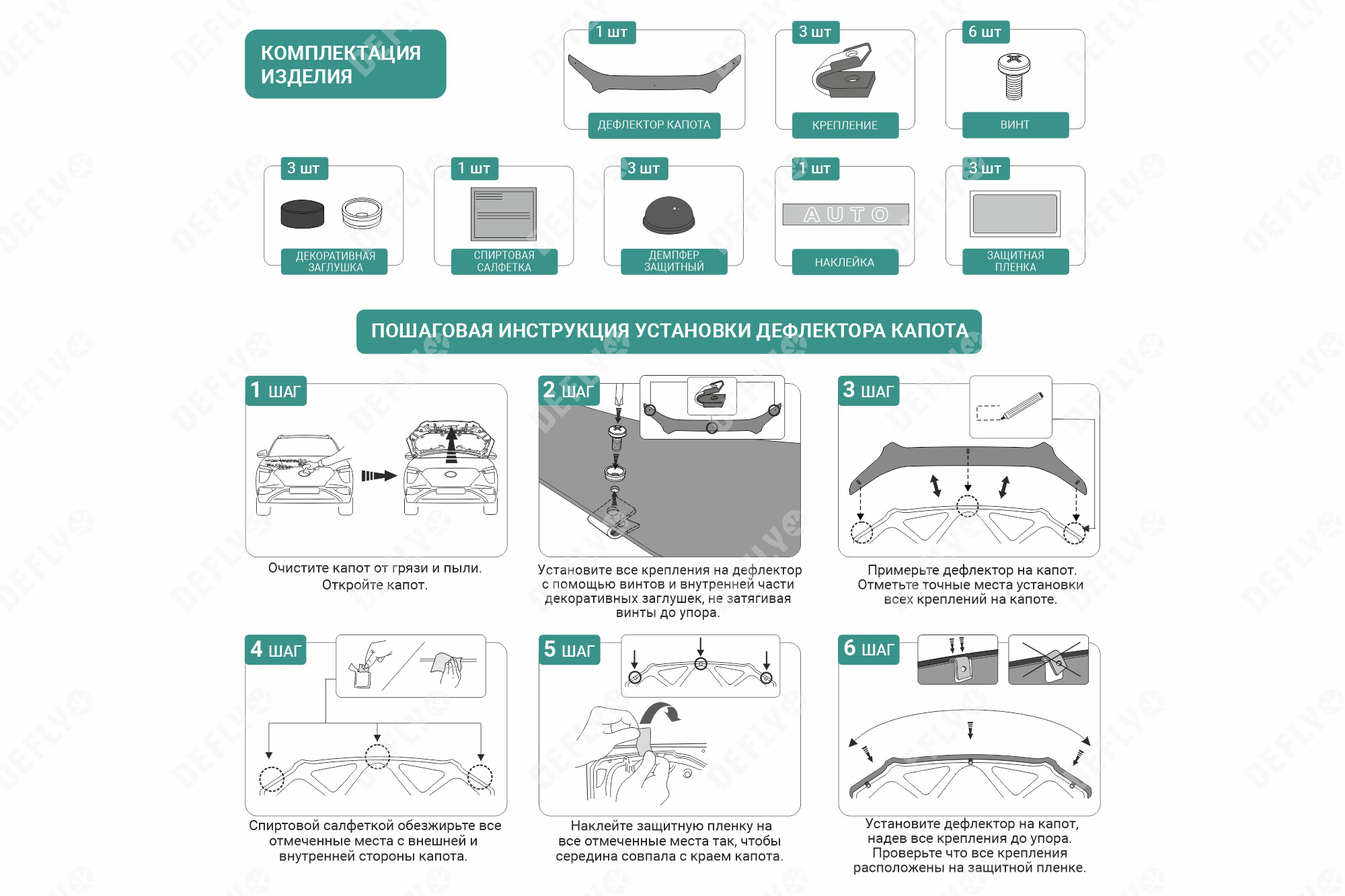 Дефлекторы капота от производителя “Defly” серии “Classic” отличаются доступными ценами и повышенными защитными свойствами. Агрессивная аэродинамическая форма дефлектора эффективно перенаправляет воздушные потоки, защищая лакокрасочное покрытие капота и лобовое стекло автомобиля. Универсальная система креплений обеспечивает простую установку, не требующую сверления, и надежную фиксацию. Дополнительные демпферы предотвращают вибрации дефлектора при движении. Изделие легко снимается, что позволяет беспрепятственно мыть, красить и производить необходимые действия с транспортным средством.
