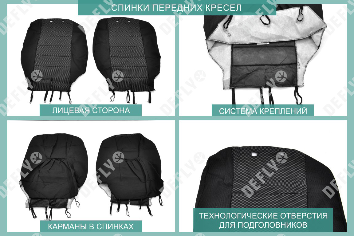Материал: Жаккард, Цвет: Черный и темно-серый (оттенок и рисунок ткани может незначительно отличаться). Модельные чехлы от производителя “Defly” индивидуально сконструированы для каждого автомобиля. Изготовленные по лекалам оригинальных кресел, чехлы гарантируют идеальную посадку. В комплектацию входят детали всех элементов салона: передних кресел, заднего дивана, третьего ряда сидений, подголовников, подлокотников и т.д. Спинки передних кресел дополнены карманами. Все швы и технологические отверстия обработаны на оверлоке. Чехлы не ограничивают заводскую функциональность салона. Наличие в чехлах специального распускаемого шва не препятствует своевременному и полному раскрытию подушек безопасности. Специально разработанная система креплений позволяет надежно зафиксировать изделия. Авточехлы изготовлены из двух видов жаккарда: черного и темно-серого с рисунком. Подголовники, боковые и задние элементы выполнены из черного жаккарда. Центральные вставки сидений изготовлены из темно-серого жаккарда. Жаккард обеспечивает циркуляцию воздуха, что обеспечивает комфорт при длительных поездках. * Представленные фотографии являются примером исполнения и служат для демонстрации материалов и конструкции чехлов