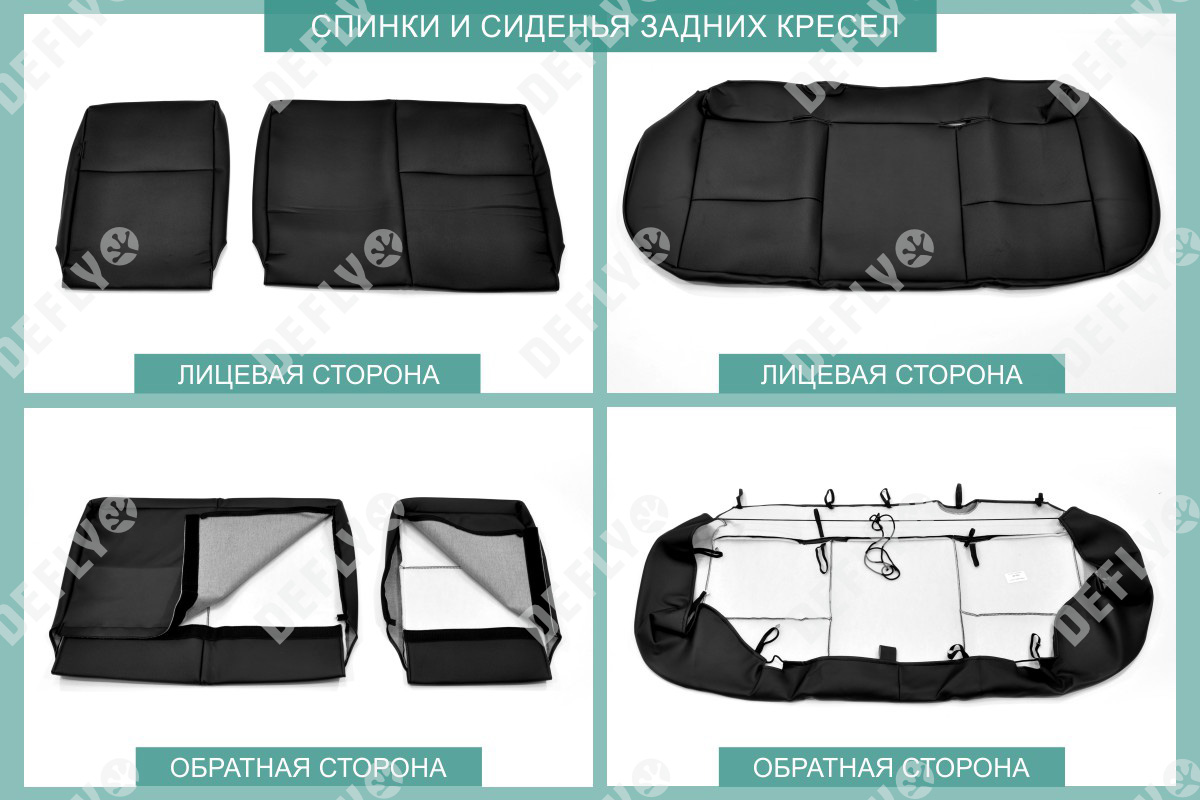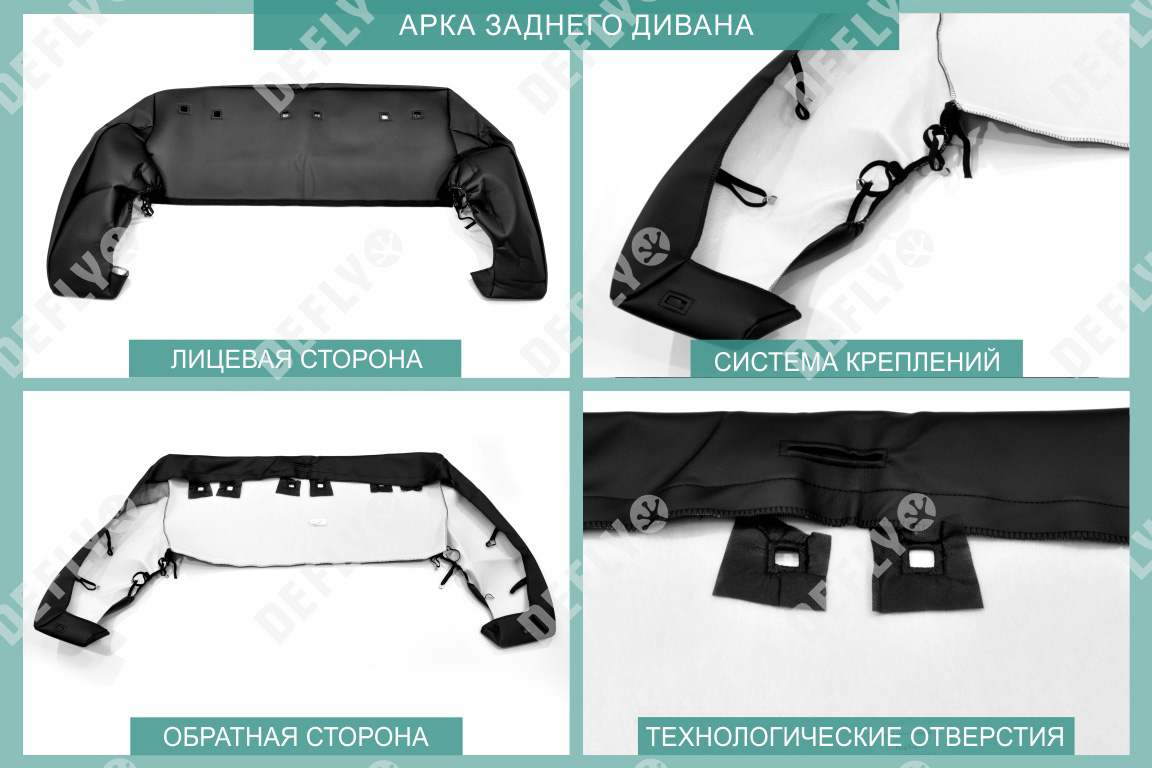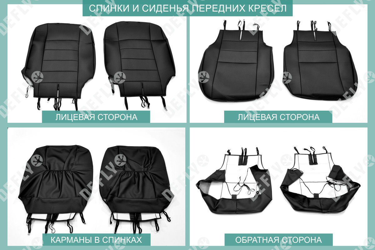 Материал: Экокожа гладкая, экокожа перфорированная, Цвет: Черный (оттенок ткани может незначительно отличаться). Модельные чехлы от производителя “Defly” индивидуально сконструированы для каждого автомобиля. Изготовленные по лекалам оригинальных кресел, чехлы гарантируют идеальную посадку. В комплектацию входят детали всех элементов салона: передних кресел, заднего дивана, третьего ряда сидений, подголовников, подлокотников и т.д. Спинки передних кресел дополнены карманами. Все швы и технологические отверстия обработаны на оверлоке. Чехлы не ограничивают заводскую функциональность салона. Наличие в чехлах специального распускаемого шва не препятствует своевременному и полному раскрытию подушек безопасности. Специально разработанная система креплений позволяет надежно зафиксировать изделия. Авточехлы изготовлены из двух видов экокожи черного цвета: гладкой и перфорированной. Перфорированная экокожа используется в центральных элементах, что обеспечивает циркуляцию воздуха. * Представленные фотографии являются примером исполнения и служат для демонстрации материалов и конструкции чехлов.