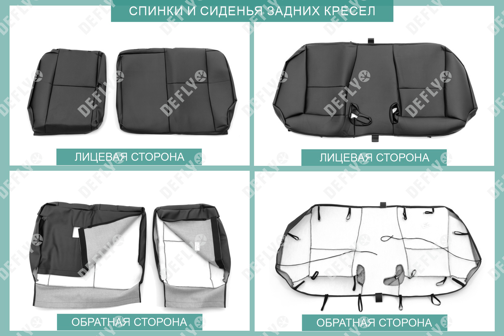 Состав комплекта: 12 изделий. Первый ряд: Спинка кресла - 2 шт. Сиденье левого кресла - 1 шт. Сиденье правого кресла - 1 шт. Подголовник - 2 шт. Второй ряд: Спинка дивана малая - 1 шт. Спинка дивана большая - 1 шт. Сиденье дивана - 1 шт. Подголовник - 2 шт. Центральный подголовник-1шт.