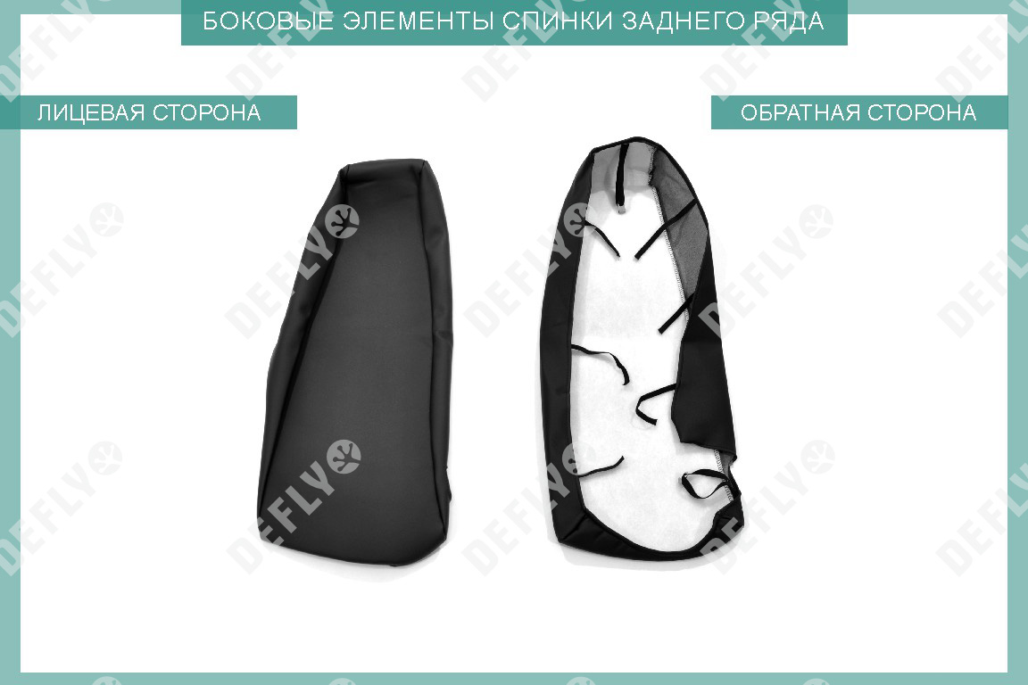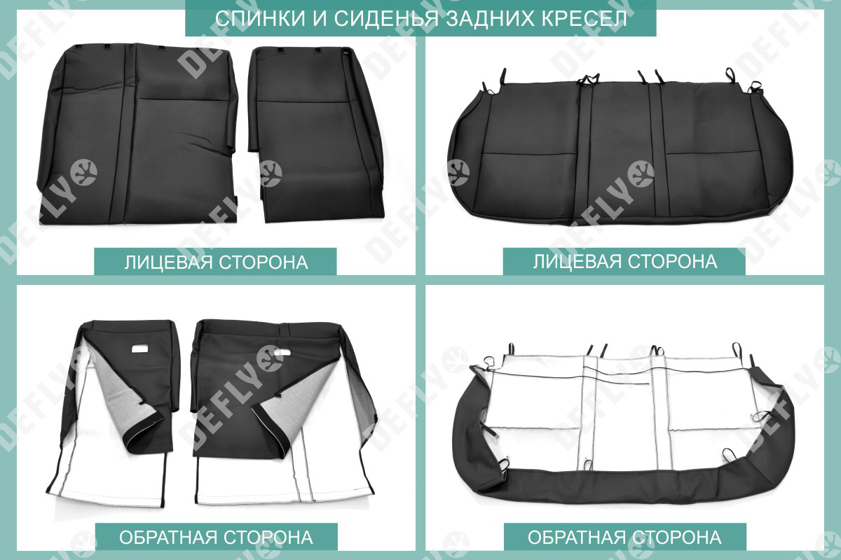 Материал: Экокожа гладкая, экокожа перфорированная, Цвет: Черный (оттенок ткани может незначительно отличаться). Модельные чехлы от производителя “Defly” индивидуально сконструированы для каждого автомобиля. Изготовленные по лекалам оригинальных кресел, чехлы гарантируют идеальную посадку. Все швы и технологические отверстия обработаны на оверлоке. Чехлы не ограничивают заводскую функциональность салона. Наличие в чехлах специального распускаемого шва не препятствует своевременному и полному раскрытию подушек безопасности. Специально разработанная система креплений позволяет надежно зафиксировать изделия. Авточехлы изготовлены из двух видов экокожи черного цвета: гладкой и перфорированной. Перфорированная экокожа используется в центральных элементах, что обеспечивает циркуляцию воздуха. * Представленные фотографии являются примером исполнения и служат для демонстрации материалов и конструкции чехлов.