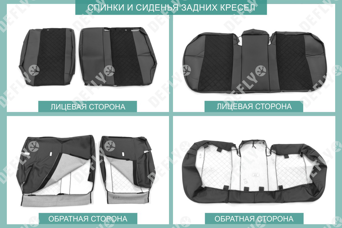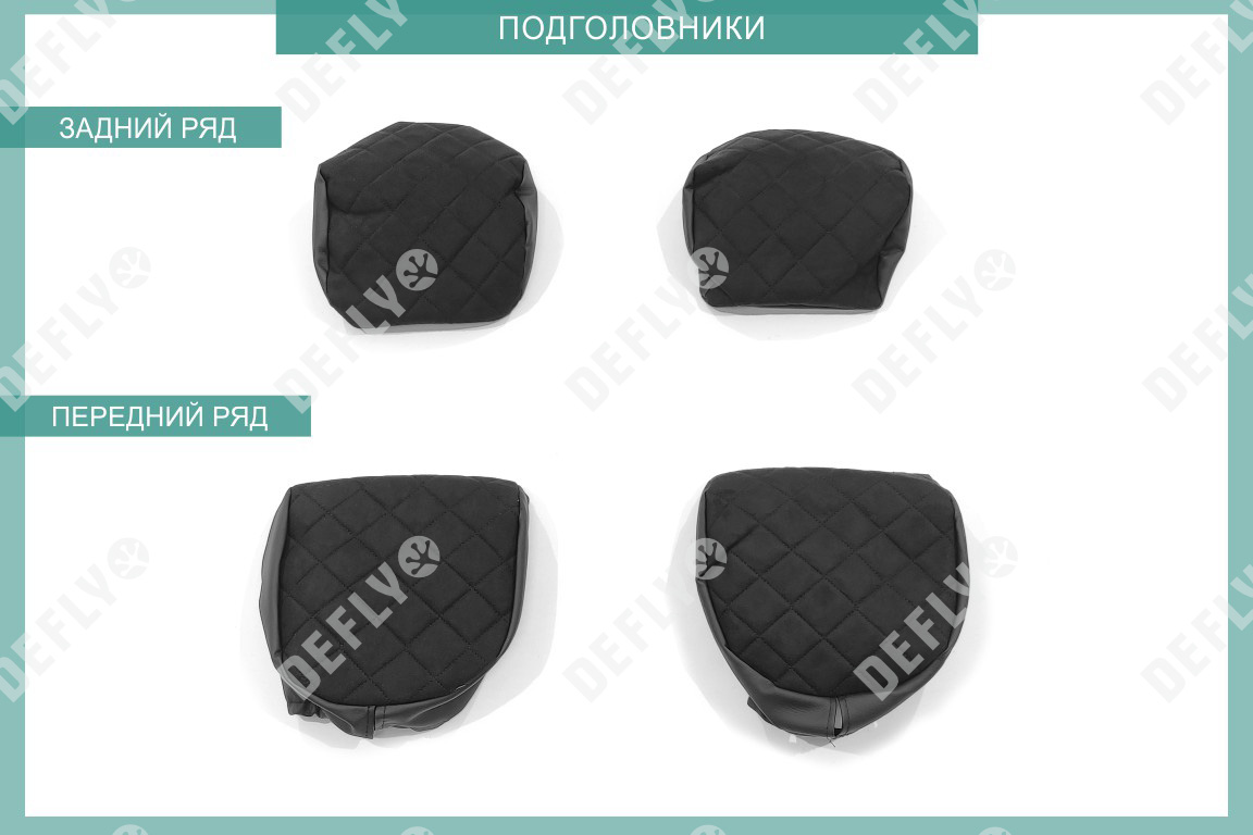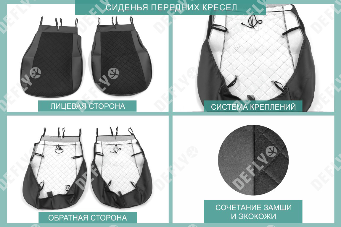 Материал: Экокожа гладкая, замша, Узор на вставках: прострочка «Ромб», Цвет: Черный (оттенок ткани может незначительно отличаться). Модельные чехлы от производителя “Defly” индивидуально сконструированы для каждого автомобиля. Изготовленные по лекалам оригинальных кресел, чехлы гарантируют идеальную посадку. В комплектацию входят детали всех элементов салона: передних кресел, заднего дивана, третьего ряда сидений, подголовников, подлокотников и т.д. Спинки передних кресел дополнены карманами. Все швы и технологические отверстия обработаны на оверлоке. Чехлы не ограничивают заводскую функциональность салона. Наличие в чехлах специального распускаемого шва не препятствует своевременному и полному раскрытию подушек безопасности. Специально разработанная система креплений позволяет надежно зафиксировать изделия. В комбинированных чехлах этой серии подголовники, боковые и задние элементы выполнены из черной экокожи, а центральные вставки сидений изготовлены из замши с прострочкой “Ромб”. Гарантируют комфортную посадку и приятные тактильные ощущения. * Представленные фотографии являются примером исполнения и служат для демонстрации материалов и конструкции чехлов.
