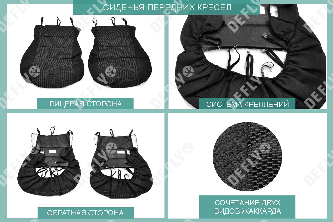 Материал: Жаккард, Цвет: Черный и темно-серый (оттенок и рисунок ткани может незначительно отличаться). Модельные чехлы от производителя “Defly” индивидуально сконструированы для каждого автомобиля. Изготовленные по лекалам оригинальных кресел, чехлы гарантируют идеальную посадку. Все швы и технологические отверстия обработаны на оверлоке. Чехлы не ограничивают заводскую функциональность салона. Наличие в чехлах специального распускаемого шва не препятствует своевременному и полному раскрытию подушек безопасности. Специально разработанная система креплений позволяет надежно зафиксировать изделия. Авточехлы изготовлены из двух видов жаккарда: черного и темно-серого с рисунком. Жаккард обеспечивает циркуляцию воздуха, что обеспечивает комфорт при длительных поездках. * Представленные фотографии являются примером исполнения и служат для демонстрации материалов и конструкции чехлов