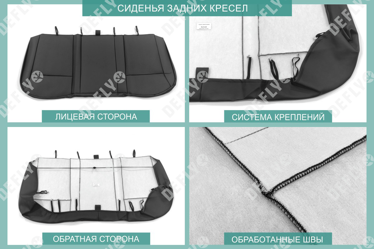 Материал: Экокожа гладкая, экокожа перфорированная, Цвет: Черный (оттенок ткани может незначительно отличаться). Модельные чехлы от производителя “Defly” индивидуально сконструированы для каждого автомобиля. Изготовленные по лекалам оригинальных кресел, чехлы гарантируют идеальную посадку. В комплектацию входят детали всех элементов салона: передних кресел, заднего дивана, третьего ряда сидений, подголовников, подлокотников и т.д. Спинки передних кресел дополнены карманами. Все швы и технологические отверстия обработаны на оверлоке. Чехлы не ограничивают заводскую функциональность салона. Наличие в чехлах специального распускаемого шва не препятствует своевременному и полному раскрытию подушек безопасности. Специально разработанная система креплений позволяет надежно зафиксировать изделия. Авточехлы изготовлены из двух видов экокожи черного цвета: гладкой и перфорированной. Перфорированная экокожа используется в центральных элементах, что обеспечивает циркуляцию воздуха. * Представленные фотографии являются примером исполнения и служат для демонстрации материалов и конструкции чехлов.