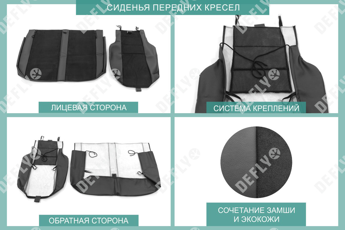 Материал: Экокожа гладкая, замша, Цвет: Черный (оттенок ткани может незначительно отличаться). Модельные чехлы от производителя “Defly” индивидуально сконструированы для каждого автомобиля. Изготовленные по лекалам оригинальных кресел, чехлы гарантируют идеальную посадку. В комплектацию входят детали всех элементов салона: передних кресел, заднего дивана, третьего ряда сидений, подголовников, подлокотников и т.д. Спинки передних кресел дополнены карманами. Все швы и технологические отверстия обработаны на оверлоке. Чехлы не ограничивают заводскую функциональность салона. Наличие в чехлах специального распускаемого шва не препятствует своевременному и полному раскрытию подушек безопасности. Специально разработанная система креплений позволяет надежно зафиксировать изделия. В комбинированных чехлах этой серии подголовники, боковые и задние элементы выполнены из черной экокожи, а центральные вставки сидений изготовлены из замши с прострочкой “Ромб”. Гарантируют комфортную посадку и приятные тактильные ощущения. * Представленные фотографии являются примером исполнения и служат для демонстрации материалов и конструкции чехлов.
