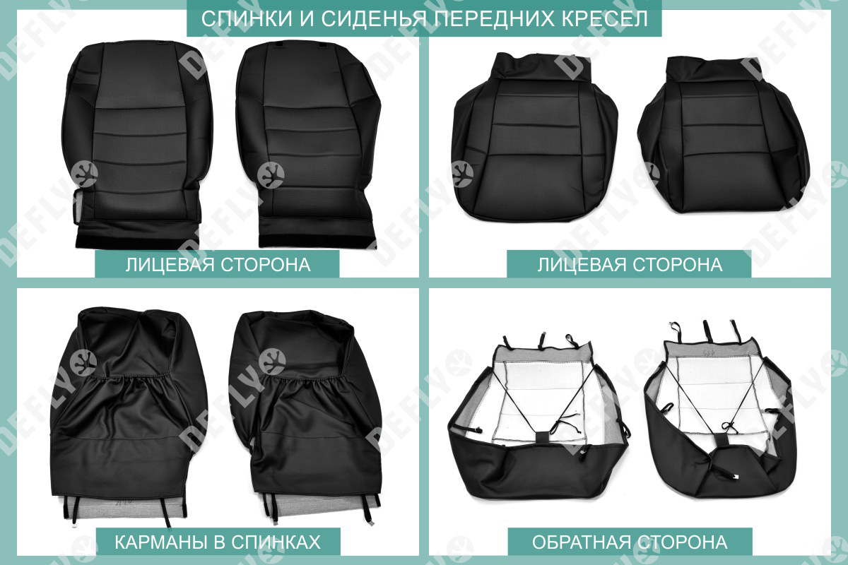 Материал: Экокожа гладкая, экокожа перфорированная, Цвет: Черный (оттенок ткани может незначительно отличаться). Модельные чехлы от производителя “Defly” индивидуально сконструированы для каждого автомобиля. Изготовленные по лекалам оригинальных кресел, чехлы гарантируют идеальную посадку. Все швы и технологические отверстия обработаны на оверлоке. Чехлы не ограничивают заводскую функциональность салона. Наличие в чехлах специального распускаемого шва не препятствует своевременному и полному раскрытию подушек безопасности. Специально разработанная система креплений позволяет надежно зафиксировать изделия. Авточехлы изготовлены из двух видов экокожи черного цвета: гладкой и перфорированной. Перфорированная экокожа используется в центральных элементах, что обеспечивает циркуляцию воздуха. * Представленные фотографии являются примером исполнения и служат для демонстрации материалов и конструкции чехлов.