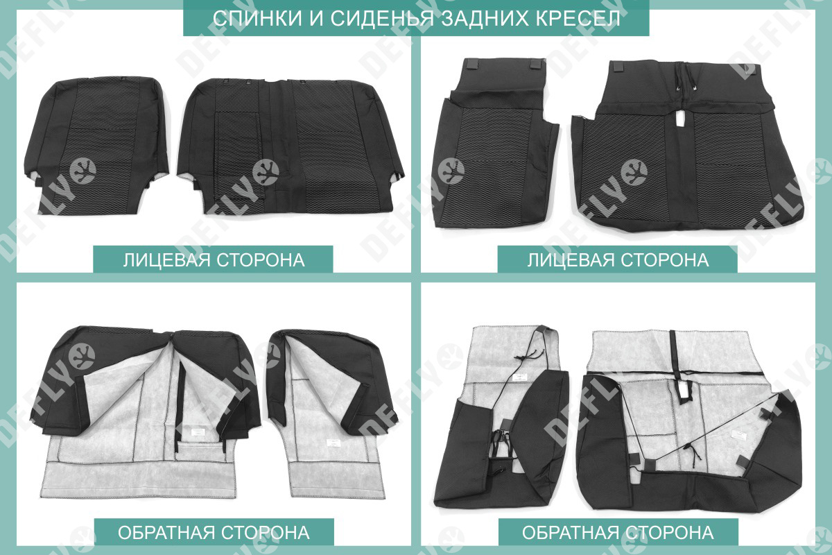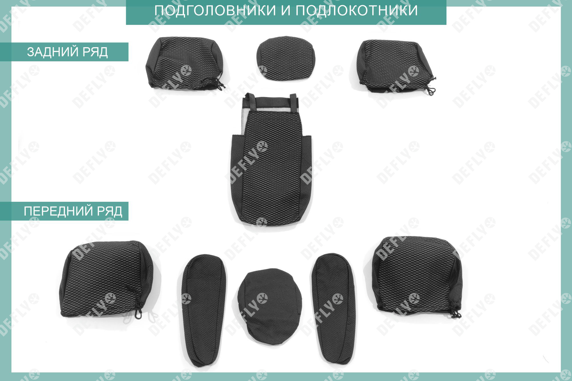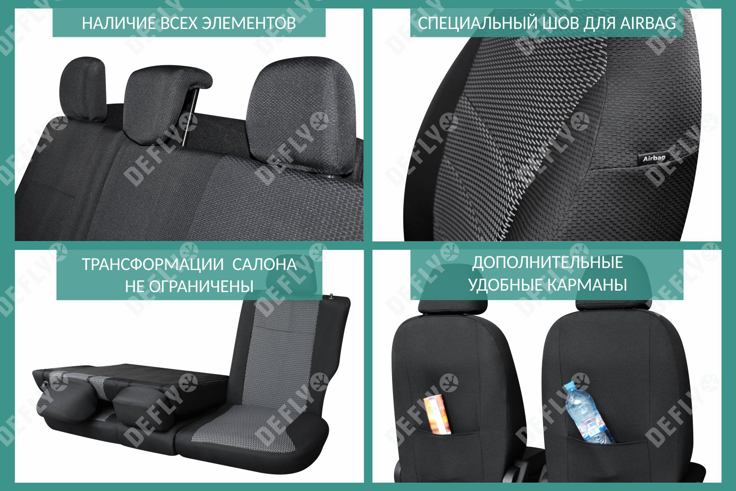 Материал: Жаккард, Цвет: Черный и темно-серый (оттенок и рисунок ткани может незначительно отличаться). Модельные чехлы от производителя “Defly” индивидуально сконструированы для каждого автомобиля. Изготовленные по лекалам оригинальных кресел, чехлы гарантируют идеальную посадку. В комплектацию входят детали всех элементов салона: передних кресел, заднего дивана, третьего ряда сидений, подголовников, подлокотников и т.д. Спинки передних кресел дополнены карманами. Все швы и технологические отверстия обработаны на оверлоке. Чехлы не ограничивают заводскую функциональность салона. Наличие в чехлах специального распускаемого шва не препятствует своевременному и полному раскрытию подушек безопасности. Специально разработанная система креплений позволяет надежно зафиксировать изделия. Авточехлы изготовлены из двух видов жаккарда: черного и темно-серого с рисунком. Подголовники, боковые и задние элементы выполнены из черного жаккарда. Центральные вставки сидений изготовлены из темно-серого жаккарда. Жаккард обеспечивает циркуляцию воздуха, что обеспечивает комфорт при длительных поездках. * Представленные фотографии являются примером исполнения и служат для демонстрации материалов и конструкции чехлов