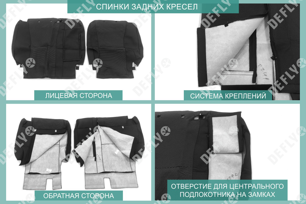 Материал: Жаккард, Цвет: Черный и темно-серый (оттенок и рисунок ткани может незначительно отличаться). Модельные чехлы от производителя “Defly” индивидуально сконструированы для каждого автомобиля. Изготовленные по лекалам оригинальных кресел, чехлы гарантируют идеальную посадку. В комплектацию входят детали всех элементов салона: передних кресел, заднего дивана, третьего ряда сидений, подголовников, подлокотников и т.д. Спинки передних кресел дополнены карманами. Все швы и технологические отверстия обработаны на оверлоке. Чехлы не ограничивают заводскую функциональность салона. Наличие в чехлах специального распускаемого шва не препятствует своевременному и полному раскрытию подушек безопасности. Специально разработанная система креплений позволяет надежно зафиксировать изделия. Авточехлы изготовлены из двух видов жаккарда: черного и темно-серого с рисунком. Подголовники, боковые и задние элементы выполнены из черного жаккарда. Центральные вставки сидений изготовлены из темно-серого жаккарда. Жаккард обеспечивает циркуляцию воздуха, что обеспечивает комфорт при длительных поездках. * Представленные фотографии являются примером исполнения и служат для демонстрации материалов и конструкции чехлов