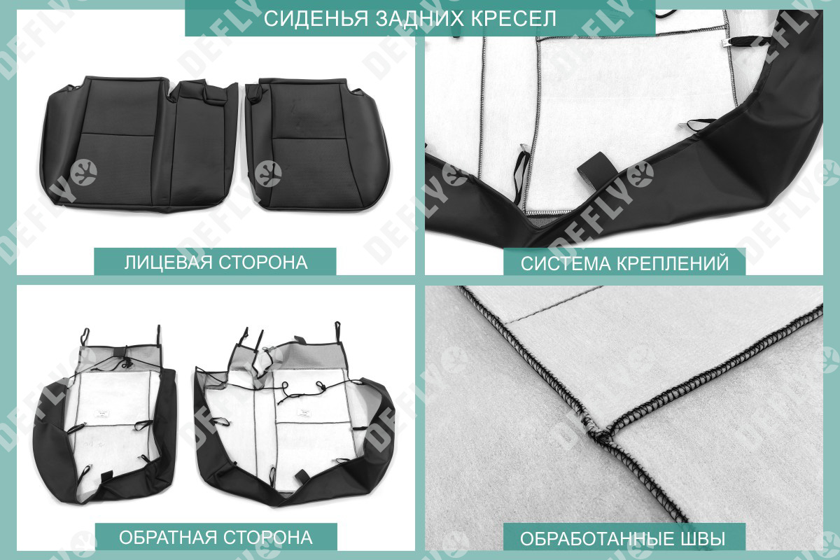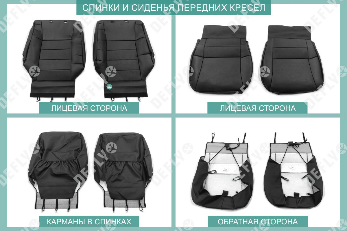 Материал: Экокожа гладкая, экокожа перфорированная, Цвет: Черный (оттенок ткани может незначительно отличаться). Модельные чехлы от производителя “Defly” индивидуально сконструированы для каждого автомобиля. Изготовленные по лекалам оригинальных кресел, чехлы гарантируют идеальную посадку. В комплектацию входят детали всех элементов салона: передних кресел, заднего дивана, третьего ряда сидений, подголовников, подлокотников и т.д. Спинки передних кресел дополнены карманами. Все швы и технологические отверстия обработаны на оверлоке. Чехлы не ограничивают заводскую функциональность салона. Наличие в чехлах специального распускаемого шва не препятствует своевременному и полному раскрытию подушек безопасности. Специально разработанная система креплений позволяет надежно зафиксировать изделия. Авточехлы изготовлены из двух видов экокожи черного цвета: гладкой и перфорированной. Перфорированная экокожа используется в центральных элементах, что обеспечивает циркуляцию воздуха. * Представленные фотографии являются примером исполнения и служат для демонстрации материалов и конструкции чехлов.