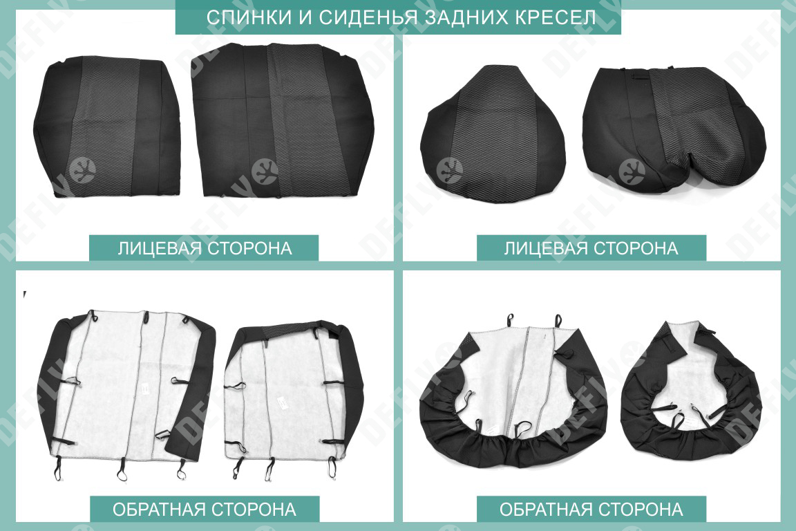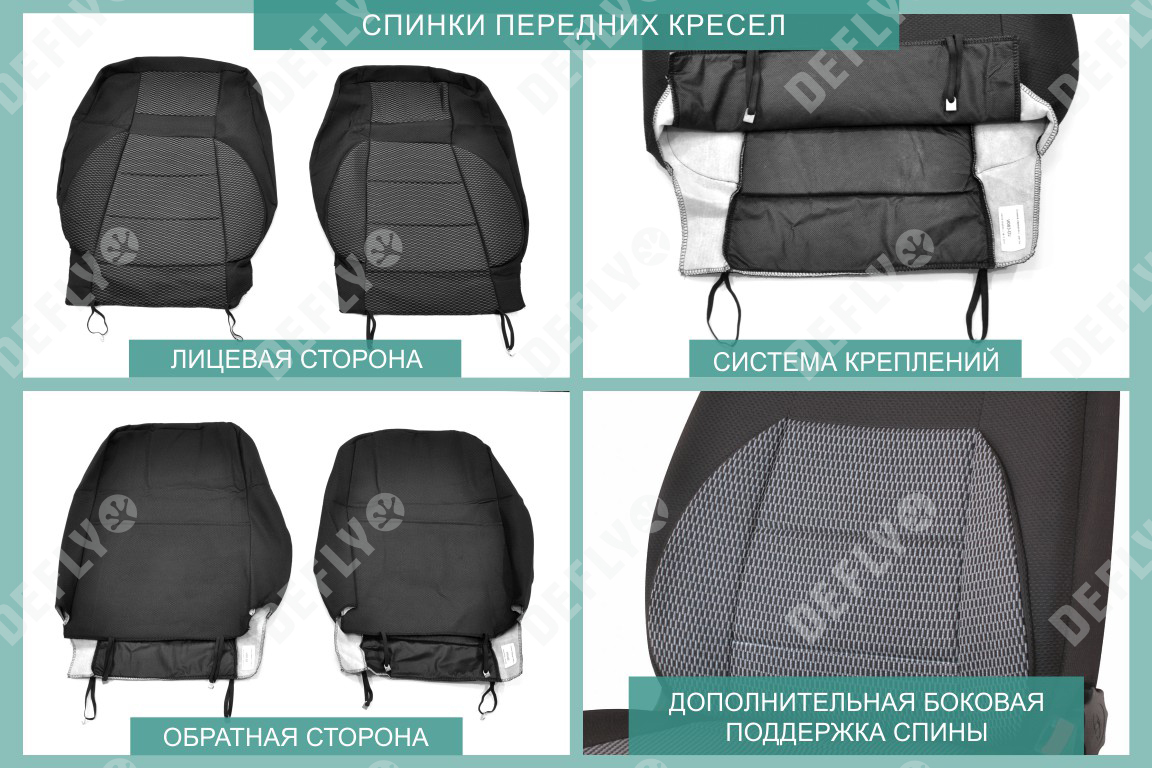 Материал: Жаккард, Цвет: Черный и темно-серый (оттенок и рисунок ткани может незначительно отличаться). Модельные чехлы от производителя “Defly” индивидуально сконструированы для каждого автомобиля. Изготовленные по лекалам оригинальных кресел, чехлы гарантируют идеальную посадку. В комплектацию входят детали всех элементов салона: передних кресел, заднего дивана, третьего ряда сидений, подголовников, подлокотников и т.д. Спинки передних кресел дополнены карманами. Все швы и технологические отверстия обработаны на оверлоке. Чехлы не ограничивают заводскую функциональность салона. Наличие в чехлах специального распускаемого шва не препятствует своевременному и полному раскрытию подушек безопасности. Специально разработанная система креплений позволяет надежно зафиксировать изделия. Авточехлы изготовлены из двух видов жаккарда: черного и темно-серого с рисунком. Подголовники, боковые и задние элементы выполнены из черного жаккарда. Центральные вставки сидений изготовлены из темно-серого жаккарда. Жаккард обеспечивает циркуляцию воздуха, что обеспечивает комфорт при длительных поездках. * Представленные фотографии являются примером исполнения и служат для демонстрации материалов и конструкции чехлов