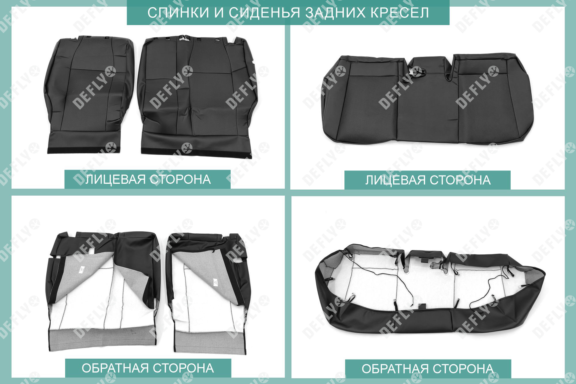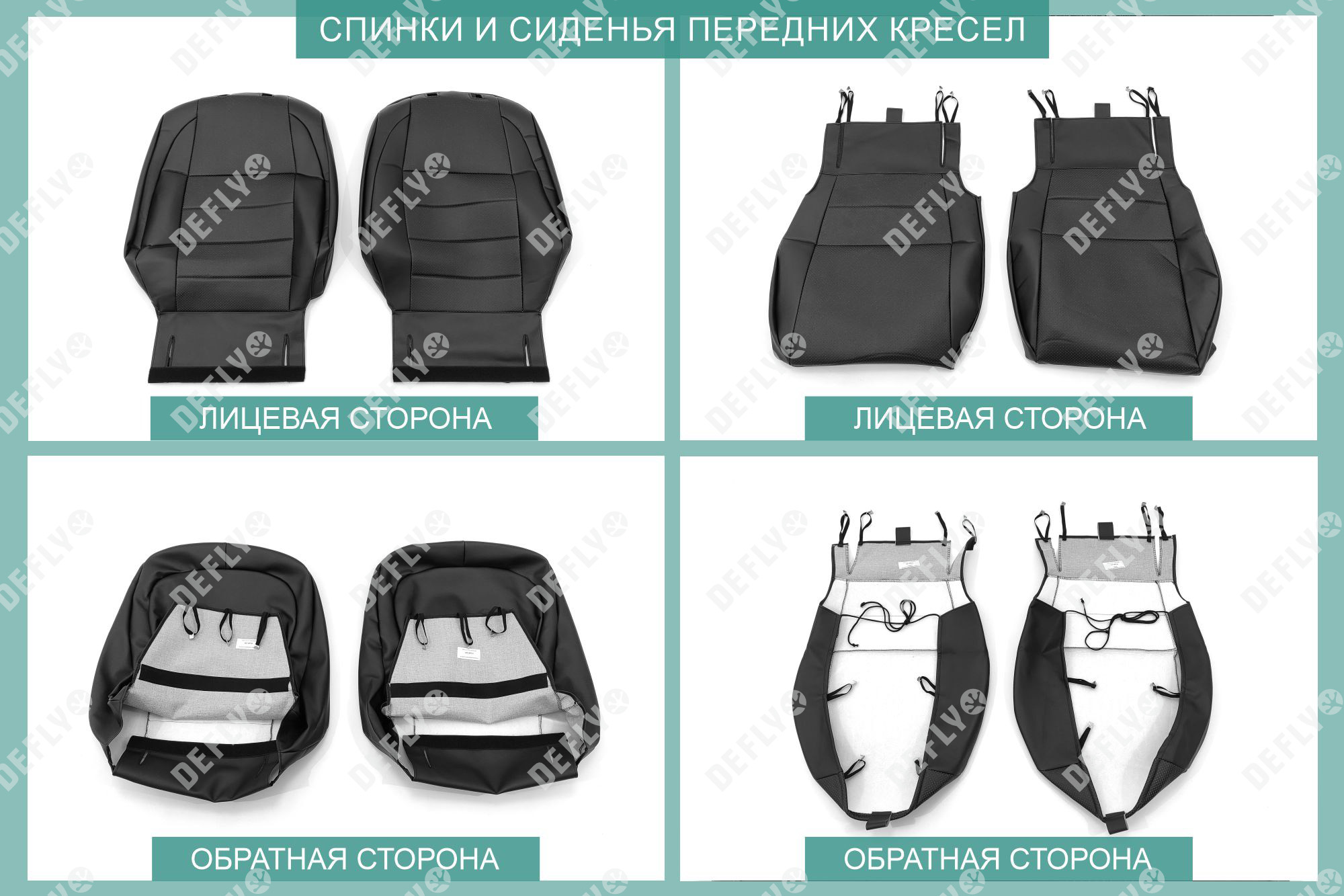 Материал: Экокожа гладкая, экокожа перфорированная, Цвет: Черный (оттенок ткани может незначительно отличаться). Модельные чехлы от производителя “Defly” индивидуально сконструированы для каждого автомобиля. Изготовленные по лекалам оригинальных кресел, чехлы гарантируют идеальную посадку. В комплектацию входят детали всех элементов салона: передних кресел, заднего дивана, третьего ряда сидений, подголовников, подлокотников и т.д. Спинки передних кресел дополнены карманами. Все швы и технологические отверстия обработаны на оверлоке. Чехлы не ограничивают заводскую функциональность салона. Наличие в чехлах специального распускаемого шва не препятствует своевременному и полному раскрытию подушек безопасности. Специально разработанная система креплений позволяет надежно зафиксировать изделия. Авточехлы изготовлены из двух видов экокожи черного цвета: гладкой и перфорированной. Перфорированная экокожа используется в центральных элементах, что обеспечивает циркуляцию воздуха. * Представленные фотографии являются примером исполнения и служат для демонстрации материалов и конструкции чехлов.