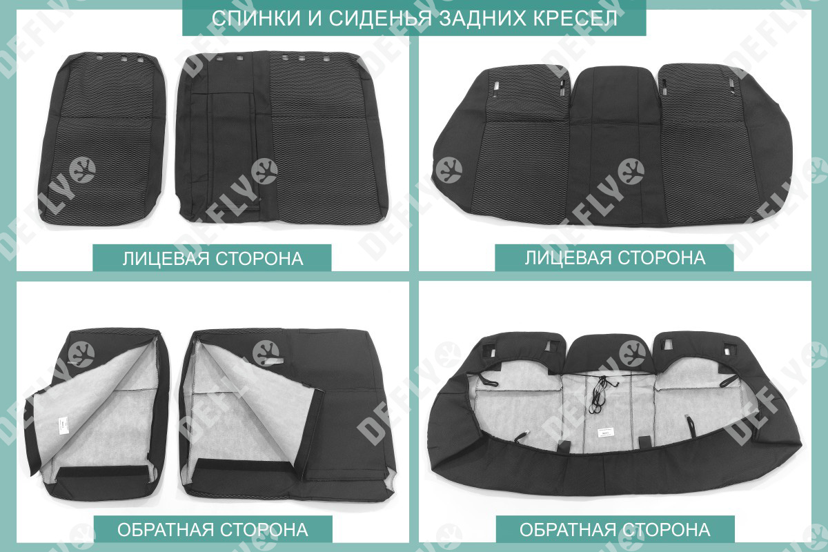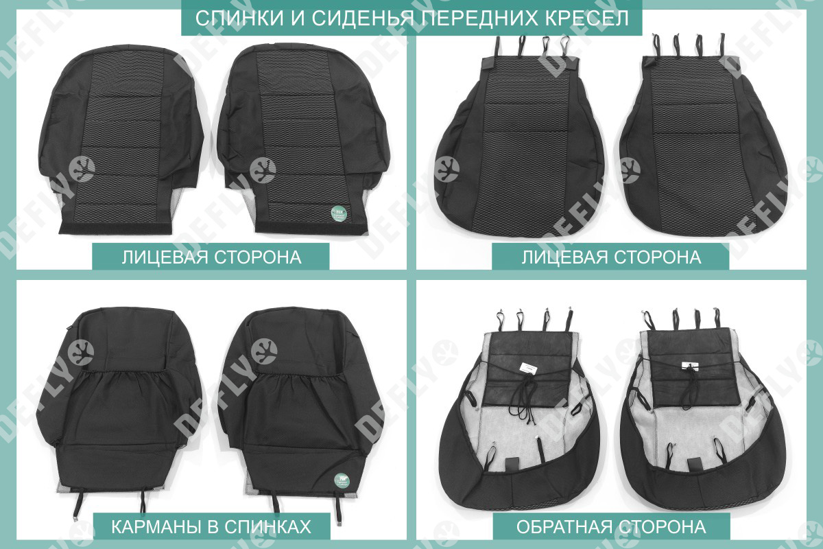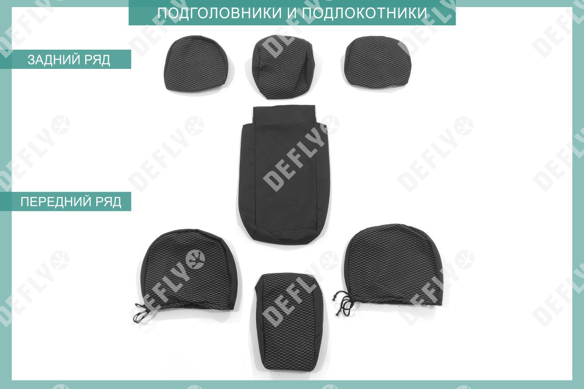 Материал: Жаккард, Цвет: Черный и темно-серый (оттенок и рисунок ткани может незначительно отличаться). Модельные чехлы от производителя “Defly” индивидуально сконструированы для каждого автомобиля. Изготовленные по лекалам оригинальных кресел, чехлы гарантируют идеальную посадку. В комплектацию входят детали всех элементов салона: передних кресел, заднего дивана, третьего ряда сидений, подголовников, подлокотников и т.д. Спинки передних кресел дополнены карманами. Все швы и технологические отверстия обработаны на оверлоке. Чехлы не ограничивают заводскую функциональность салона. Наличие в чехлах специального распускаемого шва не препятствует своевременному и полному раскрытию подушек безопасности. Специально разработанная система креплений позволяет надежно зафиксировать изделия. Авточехлы изготовлены из двух видов жаккарда: черного и темно-серого с рисунком. Подголовники, боковые и задние элементы выполнены из черного жаккарда. Центральные вставки сидений изготовлены из темно-серого жаккарда. Жаккард обеспечивает циркуляцию воздуха, что обеспечивает комфорт при длительных поездках. * Представленные фотографии являются примером исполнения и служат для демонстрации материалов и конструкции чехлов