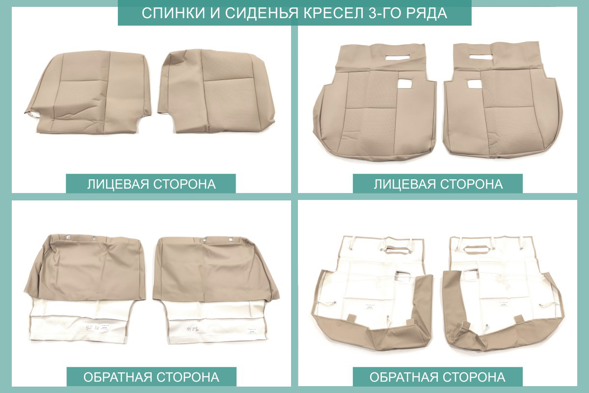 Первый ряд: Подголовник переднего кресла – 2 шт Спинка переднего кресла – 2 шт Сиденье переднего кресла – 2 шт Подлокотник переднего кресла – 2 шт Подлокотник переднего ряда центральный – 1 шт Второй ряд: Подголовник среднего ряда – 2 шт Подголовник среднего ряда центральный – 1 шт Спинка дивана среднего ряда малая – 1 шт Спинка дивана среднего рада большая – 1 шт Сиденье дивана среднего ряда большое – 1 шт Сиденье дивана среднего ряда малое – 1 шт Подлокотник среднего ряда – 1 шт Третий ряд: Подголовник заднего ряда – 2 шт Спинка дивана заднего ряда – 2 шт Сиденье дивана заднего ряда – 2 шт Итого: 23 изделия
