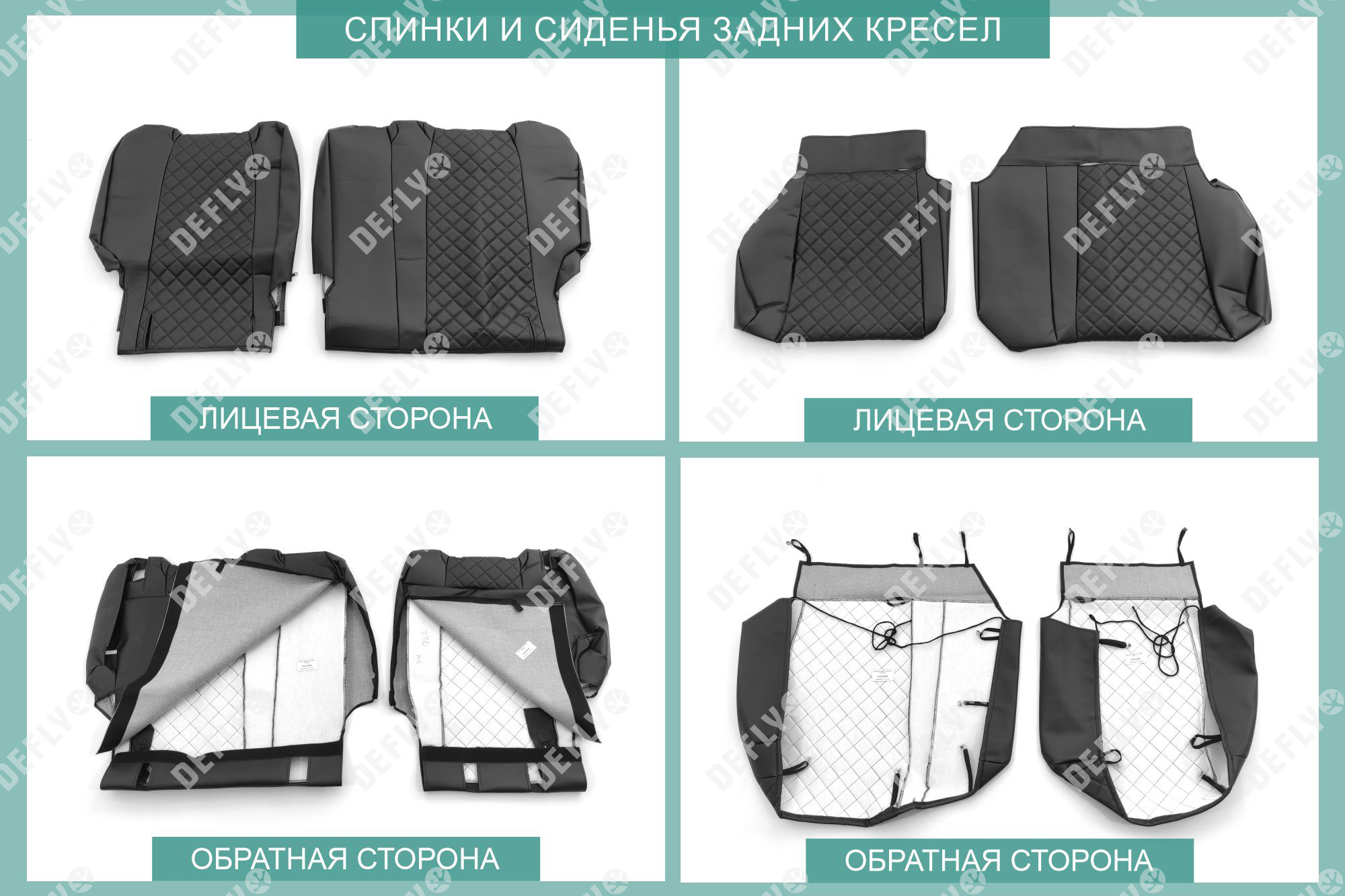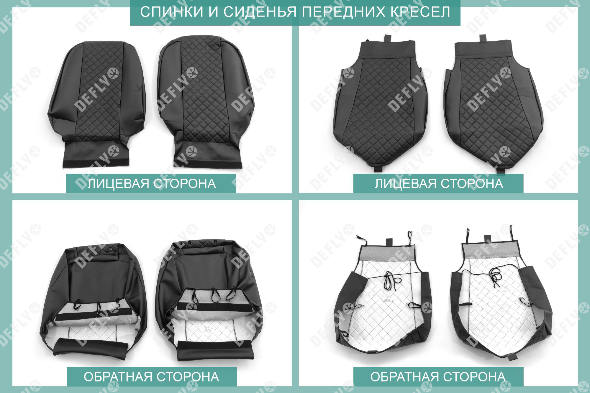 Материал: Экокожа гладкая, экокожа перфорированная, Цвет: Черный (оттенок ткани может незначительно отличаться). Модельные чехлы от производителя “Defly” индивидуально сконструированы для каждого автомобиля. Изготовленные по лекалам оригинальных кресел, чехлы гарантируют идеальную посадку. В комплектацию входят детали всех элементов салона: передних кресел, заднего дивана, третьего ряда сидений, подголовников, подлокотников и т.д. Спинки передних кресел дополнены карманами. Все швы и технологические отверстия обработаны на оверлоке. Чехлы не ограничивают заводскую функциональность салона. Наличие в чехлах специального распускаемого шва не препятствует своевременному и полному раскрытию подушек безопасности. Специально разработанная система креплений позволяет надежно зафиксировать изделия. Авточехлы изготовлены из двух видов экокожи черного цвета: гладкой и перфорированной. Перфорированная экокожа используется в центральных элементах, что обеспечивает циркуляцию воздуха. * Представленные фотографии являются примером исполнения и служат для демонстрации материалов и конструкции чехлов.