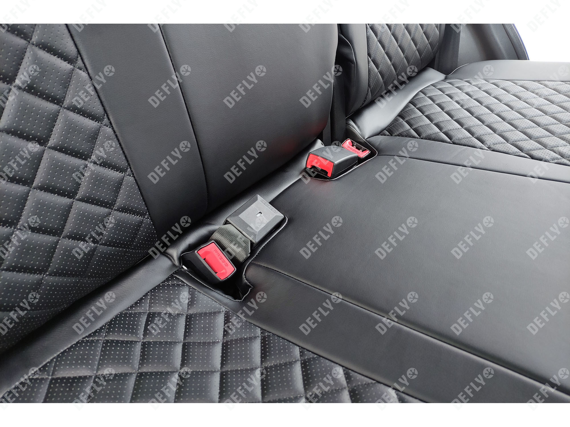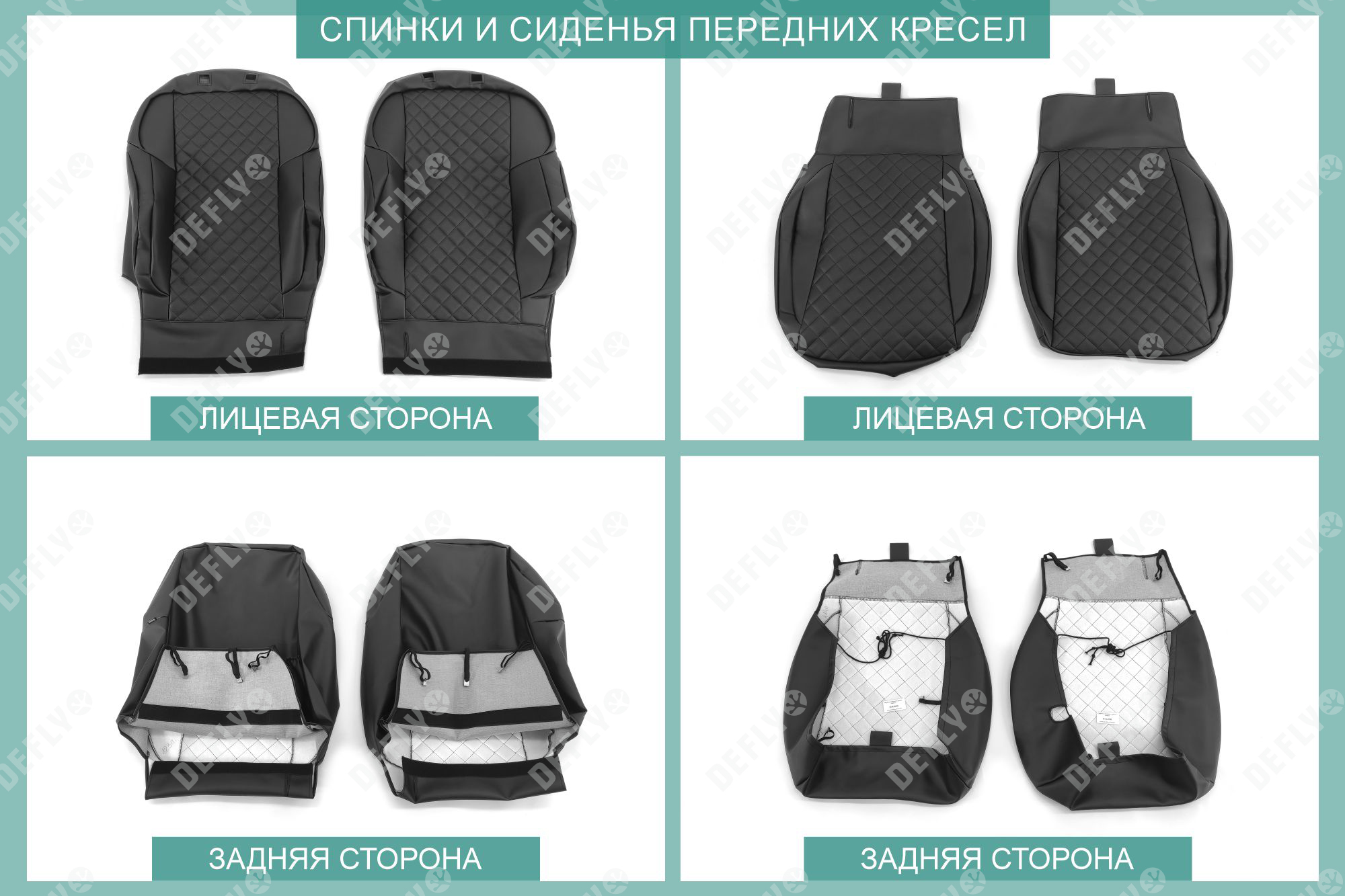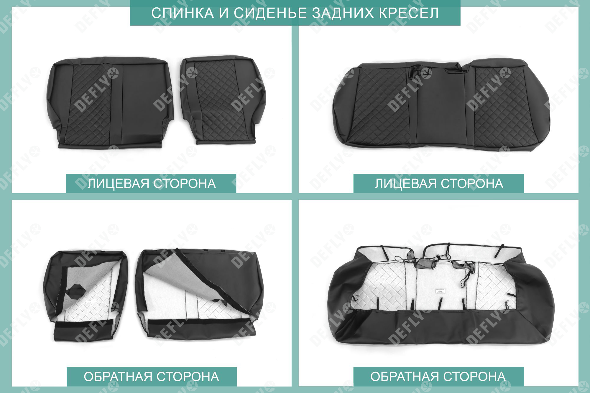 Материал: Экокожа гладкая, экокожа перфорированная, Цвет: Черный (оттенок ткани может незначительно отличаться). Модельные чехлы от производителя “Defly” индивидуально сконструированы для каждого автомобиля. Изготовленные по лекалам оригинальных кресел, чехлы гарантируют идеальную посадку. В комплектацию входят детали всех элементов салона: передних кресел, заднего дивана, третьего ряда сидений, подголовников, подлокотников и т.д. Спинки передних кресел дополнены карманами. Все швы и технологические отверстия обработаны на оверлоке. Чехлы не ограничивают заводскую функциональность салона. Наличие в чехлах специального распускаемого шва не препятствует своевременному и полному раскрытию подушек безопасности. Специально разработанная система креплений позволяет надежно зафиксировать изделия. Авточехлы изготовлены из двух видов экокожи черного цвета: гладкой и перфорированной. Перфорированная экокожа используется в центральных элементах, что обеспечивает циркуляцию воздуха. * Представленные фотографии являются примером исполнения и служат для демонстрации материалов и конструкции чехлов.