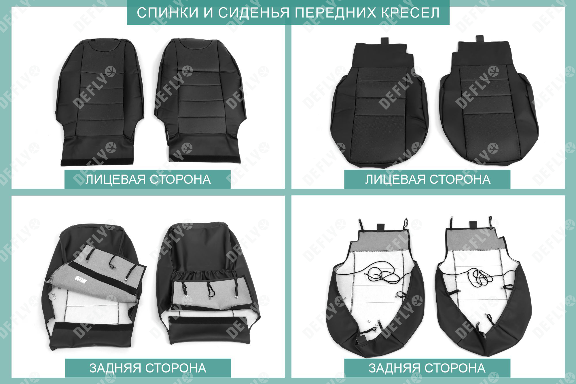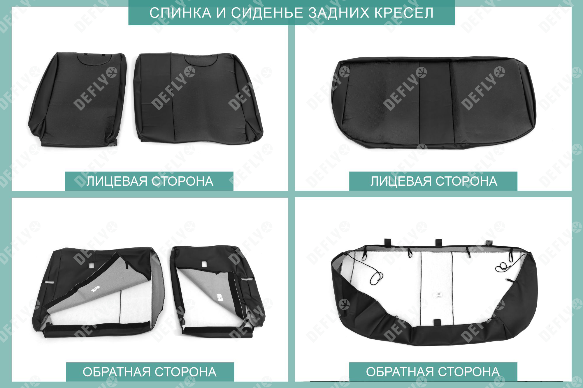 Материал: Экокожа гладкая, экокожа перфорированная, Цвет: Черный (оттенок ткани может незначительно отличаться). Модельные чехлы от производителя “Defly” индивидуально сконструированы для каждого автомобиля. Изготовленные по лекалам оригинальных кресел, чехлы гарантируют идеальную посадку. Все швы и технологические отверстия обработаны на оверлоке. Чехлы не ограничивают заводскую функциональность салона. Наличие в чехлах специального распускаемого шва не препятствует своевременному и полному раскрытию подушек безопасности. Специально разработанная система креплений позволяет надежно зафиксировать изделия. Авточехлы изготовлены из двух видов экокожи черного цвета: гладкой и перфорированной. Перфорированная экокожа используется в центральных элементах, что обеспечивает циркуляцию воздуха. * Представленные фотографии являются примером исполнения и служат для демонстрации материалов и конструкции чехлов.