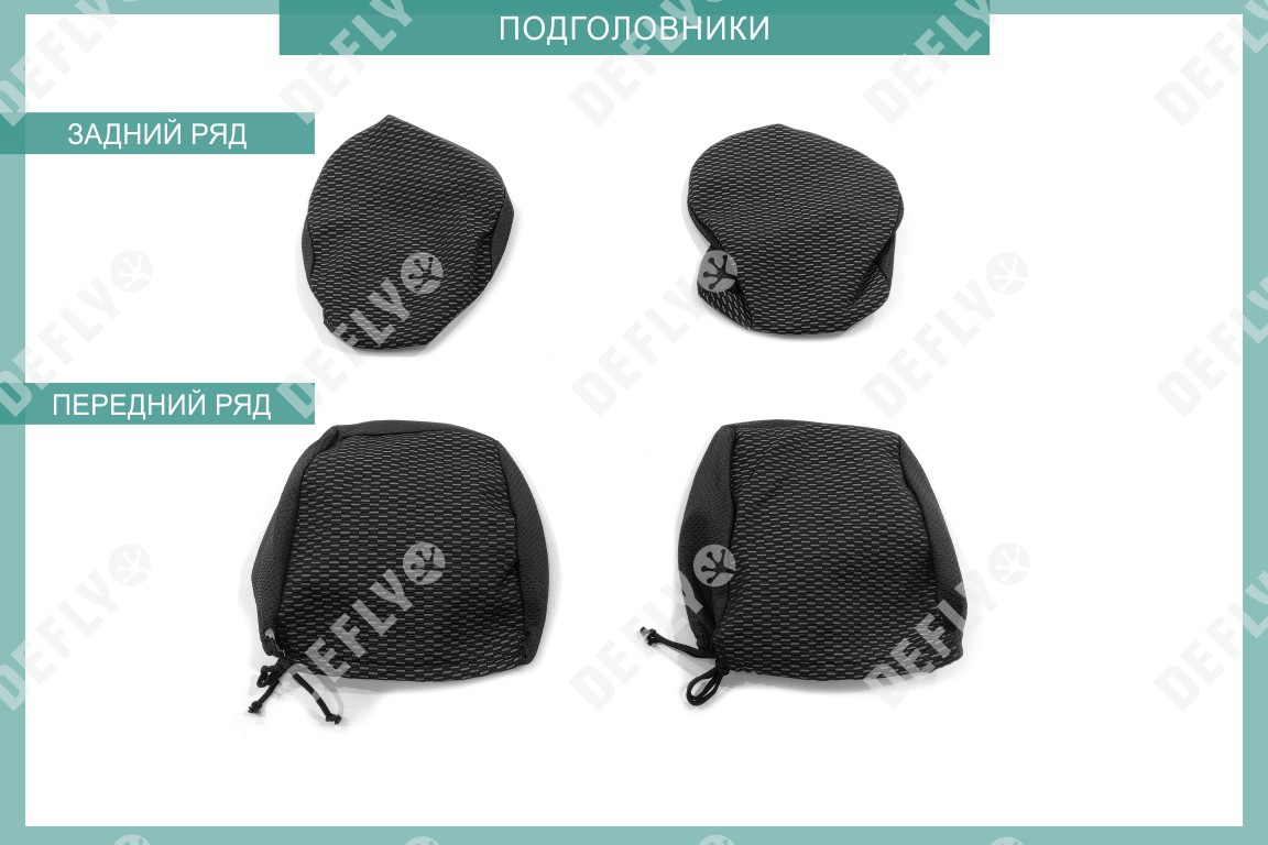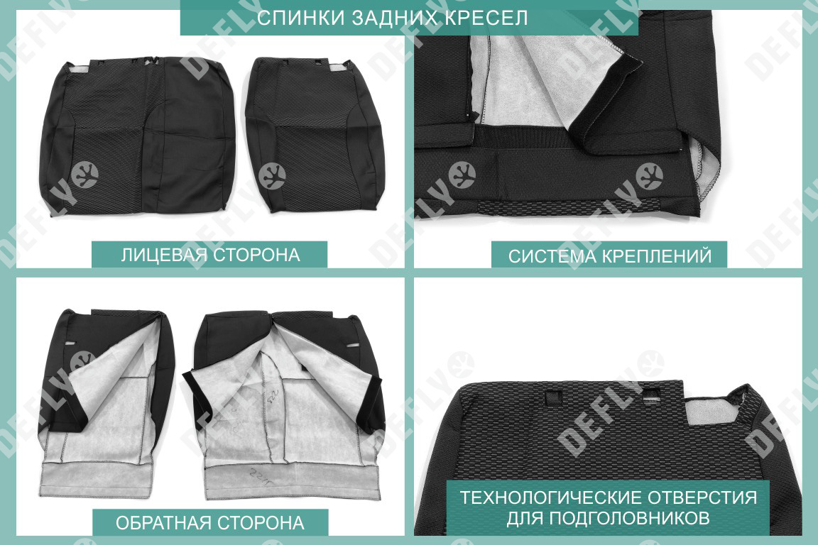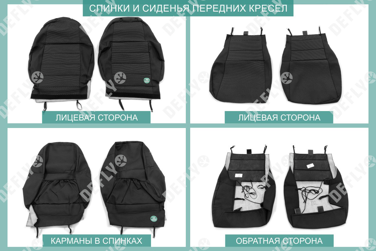 Материал: Жаккард, Цвет: Черный и темно-серый (оттенок и рисунок ткани может незначительно отличаться). Модельные чехлы от производителя “Defly” индивидуально сконструированы для каждого автомобиля. Изготовленные по лекалам оригинальных кресел, чехлы гарантируют идеальную посадку. В комплектацию входят детали всех элементов салона: передних кресел, заднего дивана, третьего ряда сидений, подголовников, подлокотников и т.д. Спинки передних кресел дополнены карманами. Все швы и технологические отверстия обработаны на оверлоке. Чехлы не ограничивают заводскую функциональность салона. Наличие в чехлах специального распускаемого шва не препятствует своевременному и полному раскрытию подушек безопасности. Специально разработанная система креплений позволяет надежно зафиксировать изделия. Авточехлы изготовлены из двух видов жаккарда: черного и темно-серого с рисунком. Подголовники, боковые и задние элементы выполнены из черного жаккарда. Центральные вставки сидений изготовлены из темно-серого жаккарда. Жаккард обеспечивает циркуляцию воздуха, что обеспечивает комфорт при длительных поездках. * Представленные фотографии являются примером исполнения и служат для демонстрации материалов и конструкции чехлов