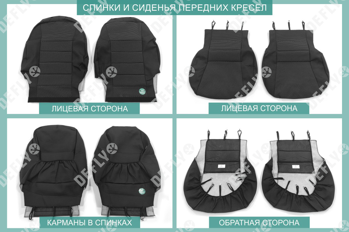 Материал: Жаккард, Цвет: Черный и темно-серый (оттенок и рисунок ткани может незначительно отличаться). Модельные чехлы от производителя “Defly” индивидуально сконструированы для каждого автомобиля. Изготовленные по лекалам оригинальных кресел, чехлы гарантируют идеальную посадку. В комплектацию входят детали всех элементов салона: передних кресел, заднего дивана, третьего ряда сидений, подголовников, подлокотников и т.д. Спинки передних кресел дополнены карманами. Все швы и технологические отверстия обработаны на оверлоке. Чехлы не ограничивают заводскую функциональность салона. Наличие в чехлах специального распускаемого шва не препятствует своевременному и полному раскрытию подушек безопасности. Специально разработанная система креплений позволяет надежно зафиксировать изделия. Авточехлы изготовлены из двух видов жаккарда: черного и темно-серого с рисунком. Подголовники, боковые и задние элементы выполнены из черного жаккарда. Центральные вставки сидений изготовлены из темно-серого жаккарда. Жаккард обеспечивает циркуляцию воздуха, что обеспечивает комфорт при длительных поездках. * Представленные фотографии являются примером исполнения и служат для демонстрации материалов и конструкции чехлов