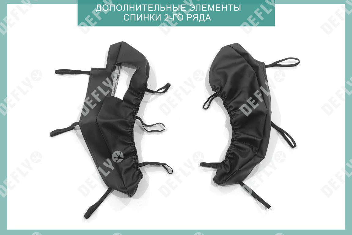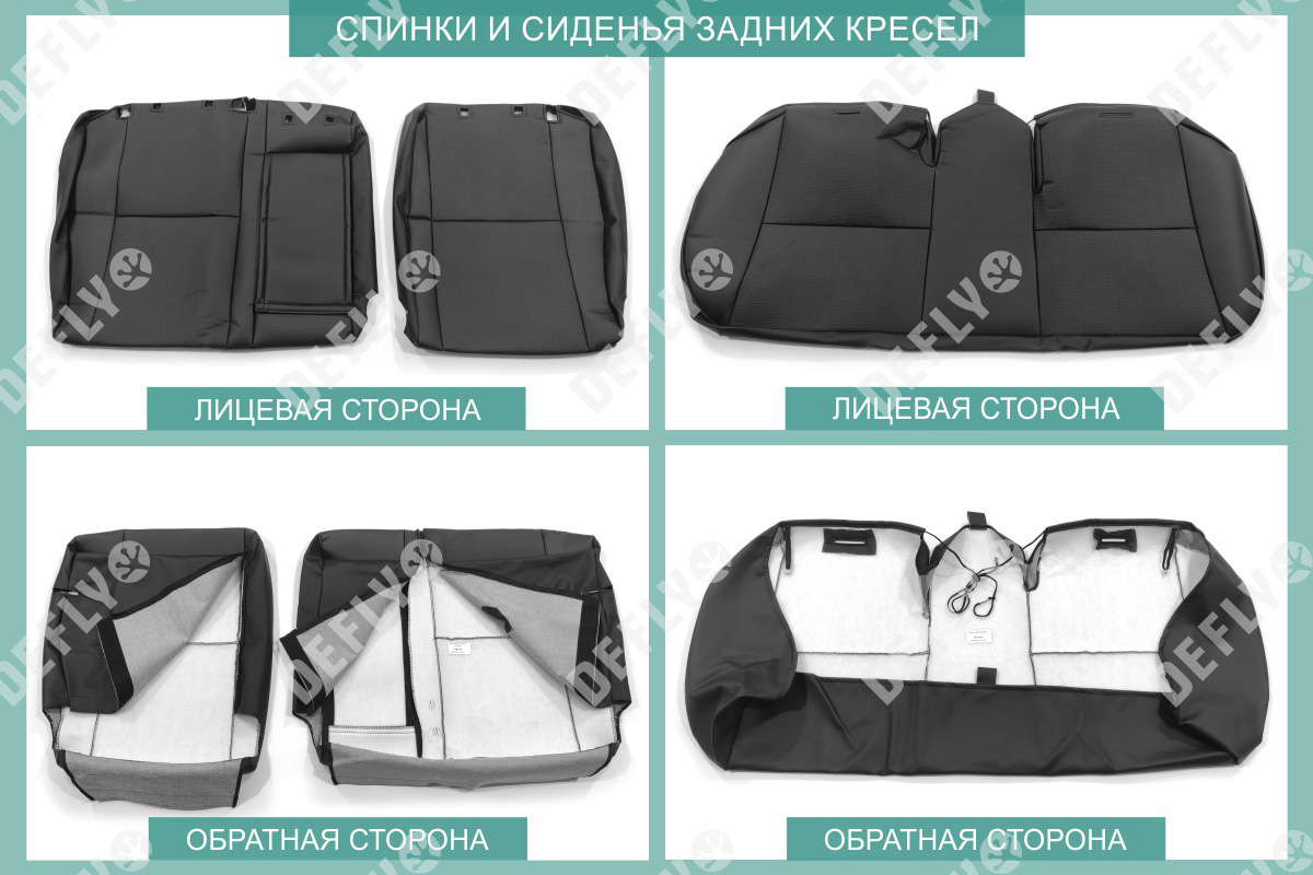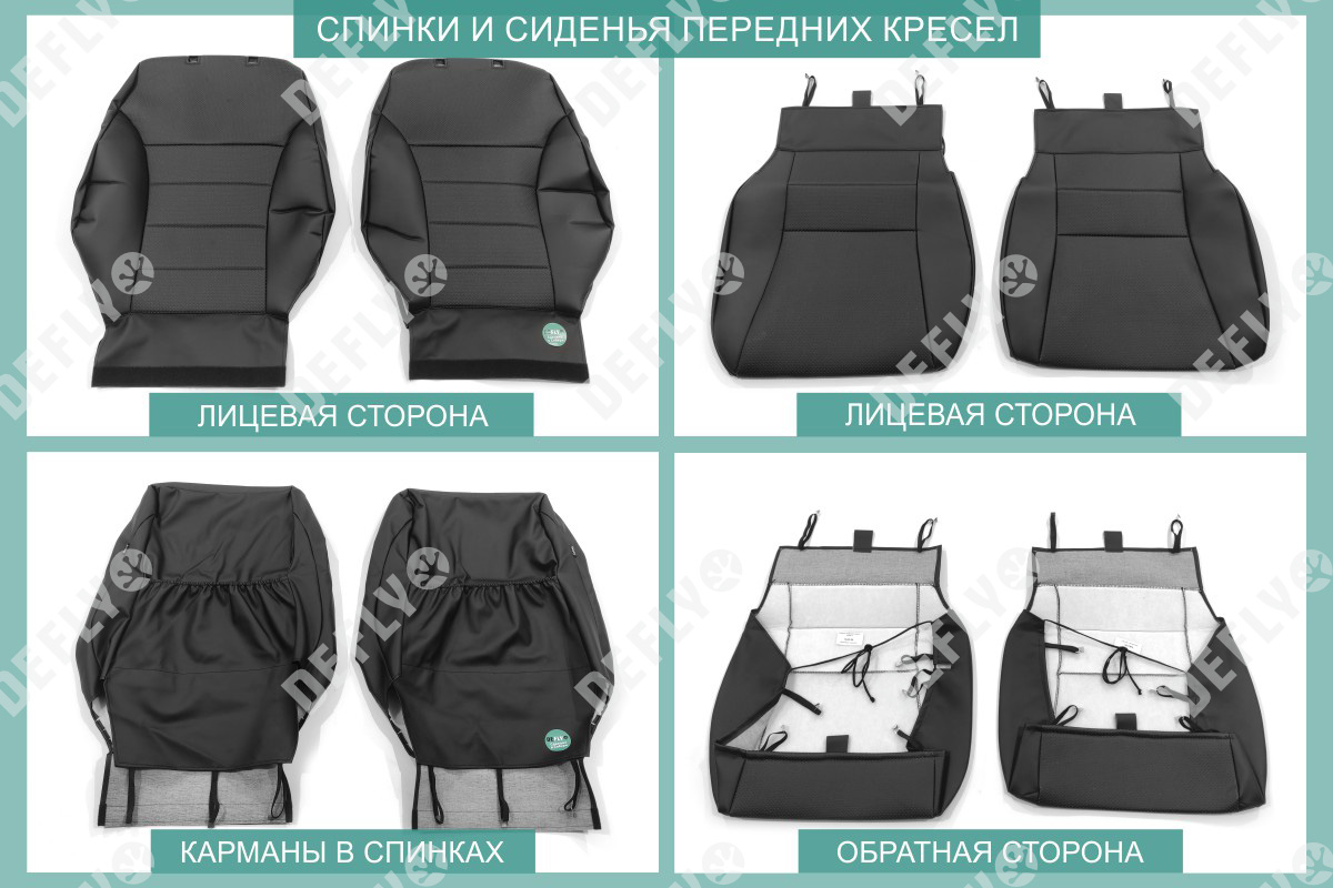Материал: Экокожа гладкая, экокожа перфорированная, Цвет: Черный (оттенок ткани может незначительно отличаться). Модельные чехлы от производителя “Defly” индивидуально сконструированы для каждого автомобиля. Изготовленные по лекалам оригинальных кресел, чехлы гарантируют идеальную посадку. В комплектацию входят детали всех элементов салона: передних кресел, заднего дивана, третьего ряда сидений, подголовников, подлокотников и т.д. Спинки передних кресел дополнены карманами. Все швы и технологические отверстия обработаны на оверлоке. Чехлы не ограничивают заводскую функциональность салона. Наличие в чехлах специального распускаемого шва не препятствует своевременному и полному раскрытию подушек безопасности. Специально разработанная система креплений позволяет надежно зафиксировать изделия. Авточехлы изготовлены из двух видов экокожи черного цвета: гладкой и перфорированной. Перфорированная экокожа используется в центральных элементах, что обеспечивает циркуляцию воздуха. * Представленные фотографии являются примером исполнения и служат для демонстрации материалов и конструкции чехлов.