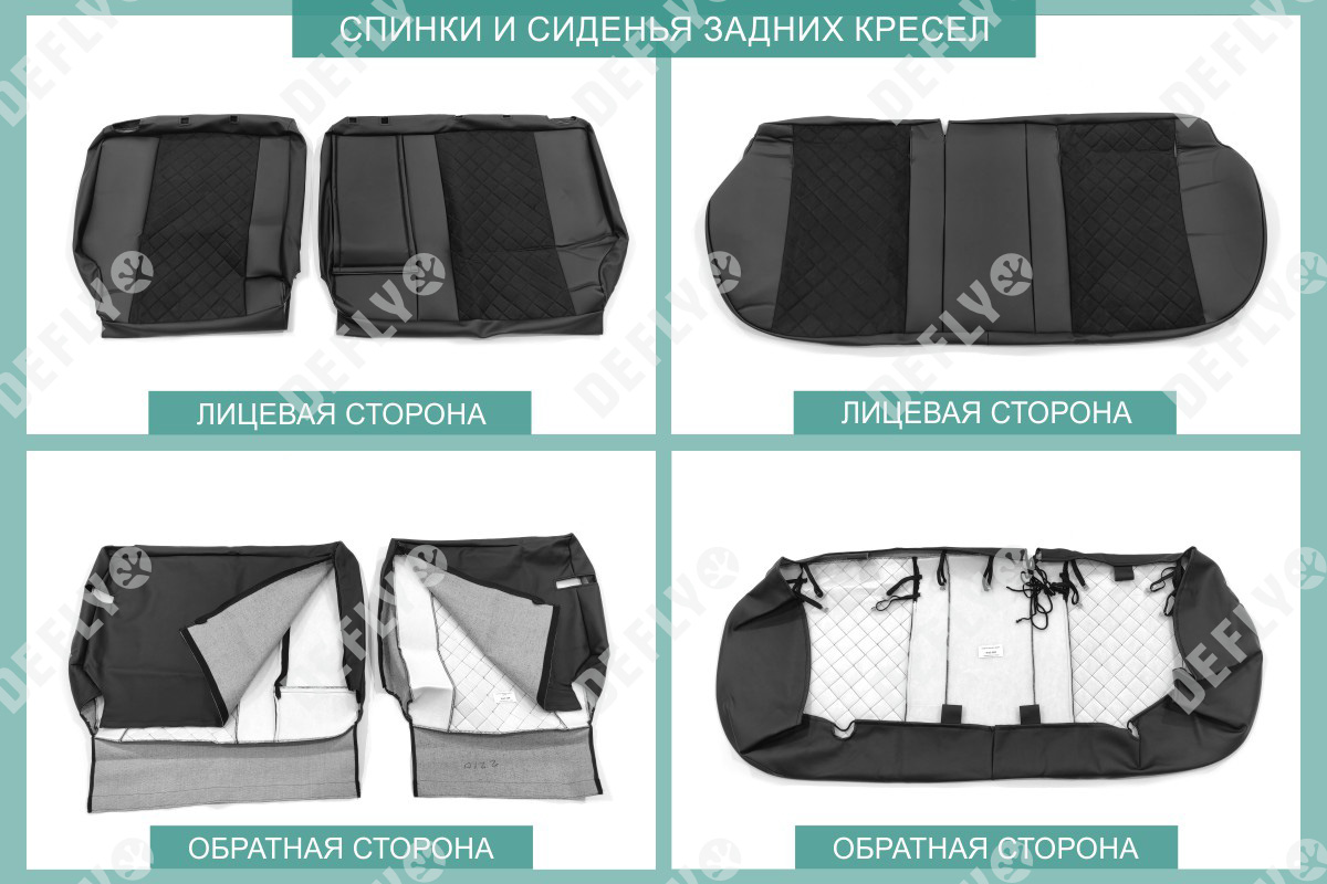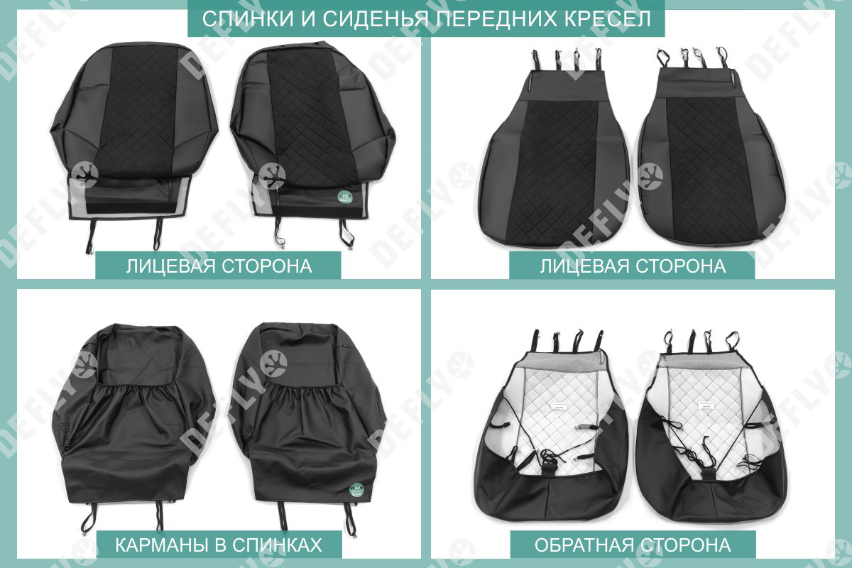 Материал: Экокожа гладкая, замша, Узор на вставках: прострочка «Ромб», Цвет: Черный (оттенок ткани может незначительно отличаться). Модельные чехлы от производителя “Defly” индивидуально сконструированы для каждого автомобиля. Изготовленные по лекалам оригинальных кресел, чехлы гарантируют идеальную посадку. В комплектацию входят детали всех элементов салона: передних кресел, заднего дивана, третьего ряда сидений, подголовников, подлокотников и т.д. Спинки передних кресел дополнены карманами. Все швы и технологические отверстия обработаны на оверлоке. Чехлы не ограничивают заводскую функциональность салона. Наличие в чехлах специального распускаемого шва не препятствует своевременному и полному раскрытию подушек безопасности. Специально разработанная система креплений позволяет надежно зафиксировать изделия. В комбинированных чехлах этой серии подголовники, боковые и задние элементы выполнены из черной экокожи, а центральные вставки сидений изготовлены из замши с прострочкой “Ромб”. Гарантируют комфортную посадку и приятные тактильные ощущения. * Представленные фотографии являются примером исполнения и служат для демонстрации материалов и конструкции чехлов.