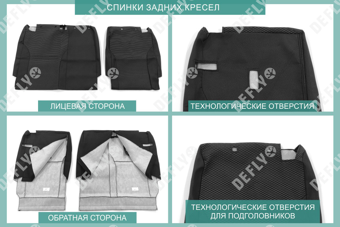Материал: Жаккард, Цвет: Черный и темно-серый (оттенок и рисунок ткани может незначительно отличаться). Модельные чехлы от производителя “Defly” индивидуально сконструированы для каждого автомобиля. Изготовленные по лекалам оригинальных кресел, чехлы гарантируют идеальную посадку. В комплектацию входят детали всех элементов салона: передних кресел, заднего дивана, третьего ряда сидений, подголовников, подлокотников и т.д. Спинки передних кресел дополнены карманами. Все швы и технологические отверстия обработаны на оверлоке. Чехлы не ограничивают заводскую функциональность салона. Наличие в чехлах специального распускаемого шва не препятствует своевременному и полному раскрытию подушек безопасности. Специально разработанная система креплений позволяет надежно зафиксировать изделия. Авточехлы изготовлены из двух видов жаккарда: черного и темно-серого с рисунком. Подголовники, боковые и задние элементы выполнены из черного жаккарда. Центральные вставки сидений изготовлены из темно-серого жаккарда. Жаккард обеспечивает циркуляцию воздуха, что обеспечивает комфорт при длительных поездках. * Представленные фотографии являются примером исполнения и служат для демонстрации материалов и конструкции чехлов