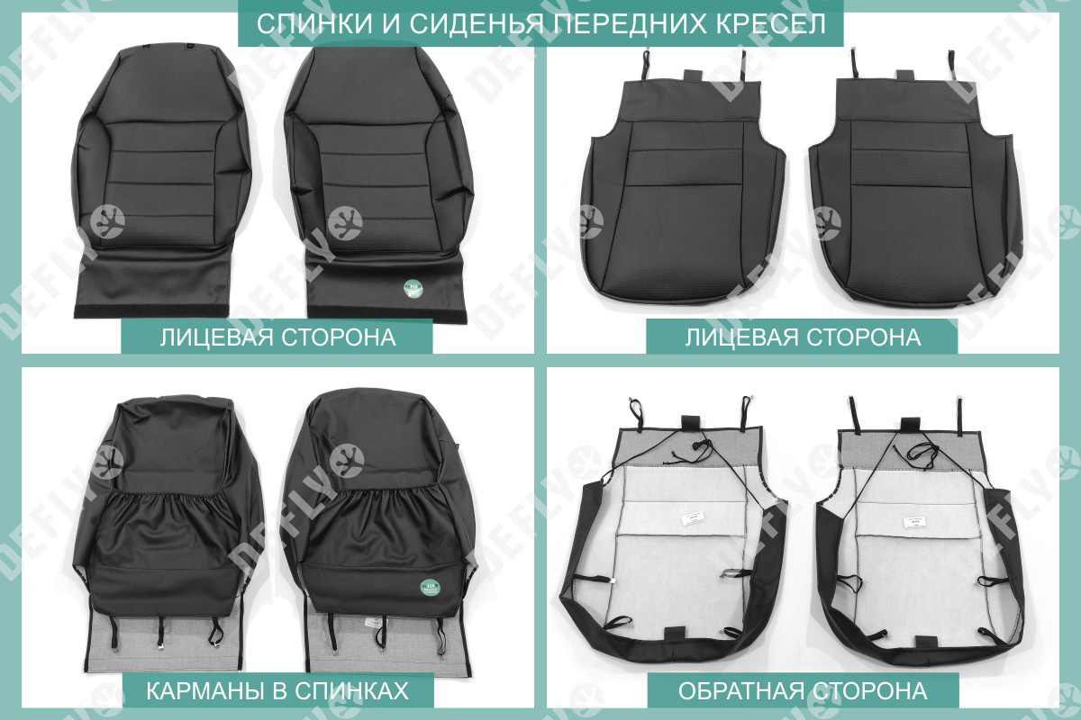 Материал: Экокожа гладкая, экокожа перфорированная, Цвет: Черный (оттенок ткани может незначительно отличаться). Модельные чехлы от производителя “Defly” индивидуально сконструированы для каждого автомобиля. Изготовленные по лекалам оригинальных кресел, чехлы гарантируют идеальную посадку. Все швы и технологические отверстия обработаны на оверлоке. Чехлы не ограничивают заводскую функциональность салона. Наличие в чехлах специального распускаемого шва не препятствует своевременному и полному раскрытию подушек безопасности. Специально разработанная система креплений позволяет надежно зафиксировать изделия. Авточехлы изготовлены из двух видов экокожи черного цвета: гладкой и перфорированной. Перфорированная экокожа используется в центральных элементах, что обеспечивает циркуляцию воздуха. * Представленные фотографии являются примером исполнения и служат для демонстрации материалов и конструкции чехлов.