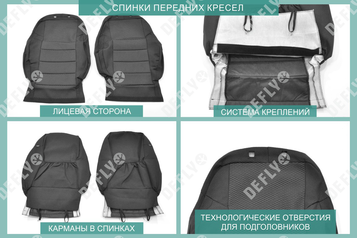 Спинка переднего кресла левого - 1 шт Спинка переднего кресла правого- 1 шт Сиденье переднего кресла- 2 шт Подголовник переднего кресла- 2 шт Всего изделий: 6шт