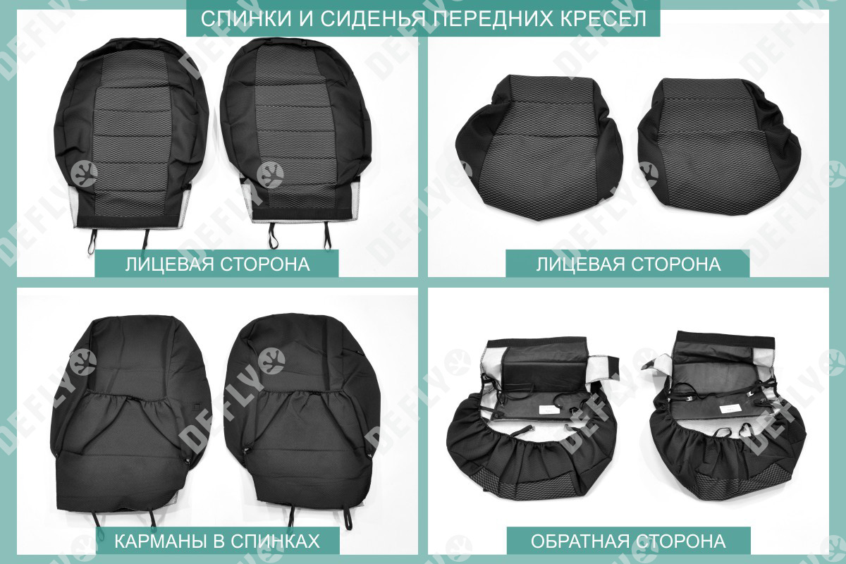 Материал: Жаккард, Цвет: Черный и темно-серый (оттенок и рисунок ткани может незначительно отличаться). Модельные чехлы от производителя “Defly” индивидуально сконструированы для каждого автомобиля. Изготовленные по лекалам оригинальных кресел, чехлы гарантируют идеальную посадку. В комплектацию входят детали всех элементов салона: передних кресел, заднего дивана, третьего ряда сидений, подголовников, подлокотников и т.д. Спинки передних кресел дополнены карманами. Все швы и технологические отверстия обработаны на оверлоке. Чехлы не ограничивают заводскую функциональность салона. Наличие в чехлах специального распускаемого шва не препятствует своевременному и полному раскрытию подушек безопасности. Специально разработанная система креплений позволяет надежно зафиксировать изделия. Авточехлы изготовлены из двух видов жаккарда: черного и темно-серого с рисунком. Подголовники, боковые и задние элементы выполнены из черного жаккарда. Центральные вставки сидений изготовлены из темно-серого жаккарда. Жаккард обеспечивает циркуляцию воздуха, что обеспечивает комфорт при длительных поездках. * Представленные фотографии являются примером исполнения и служат для демонстрации материалов и конструкции чехлов