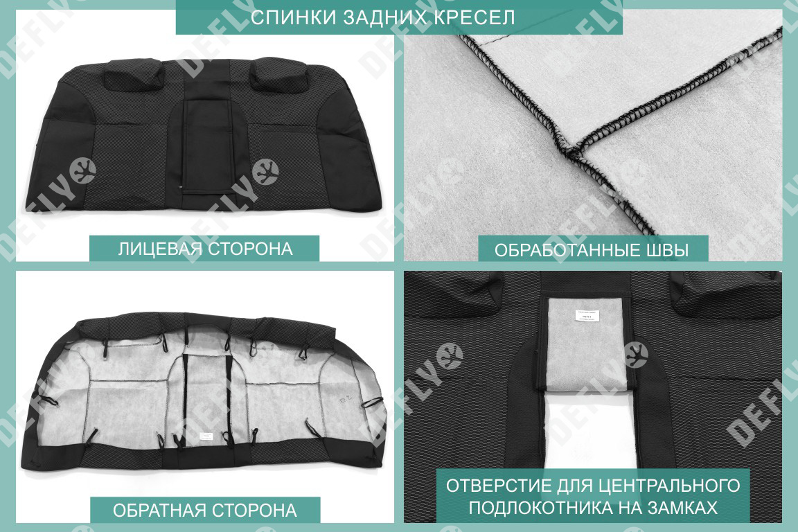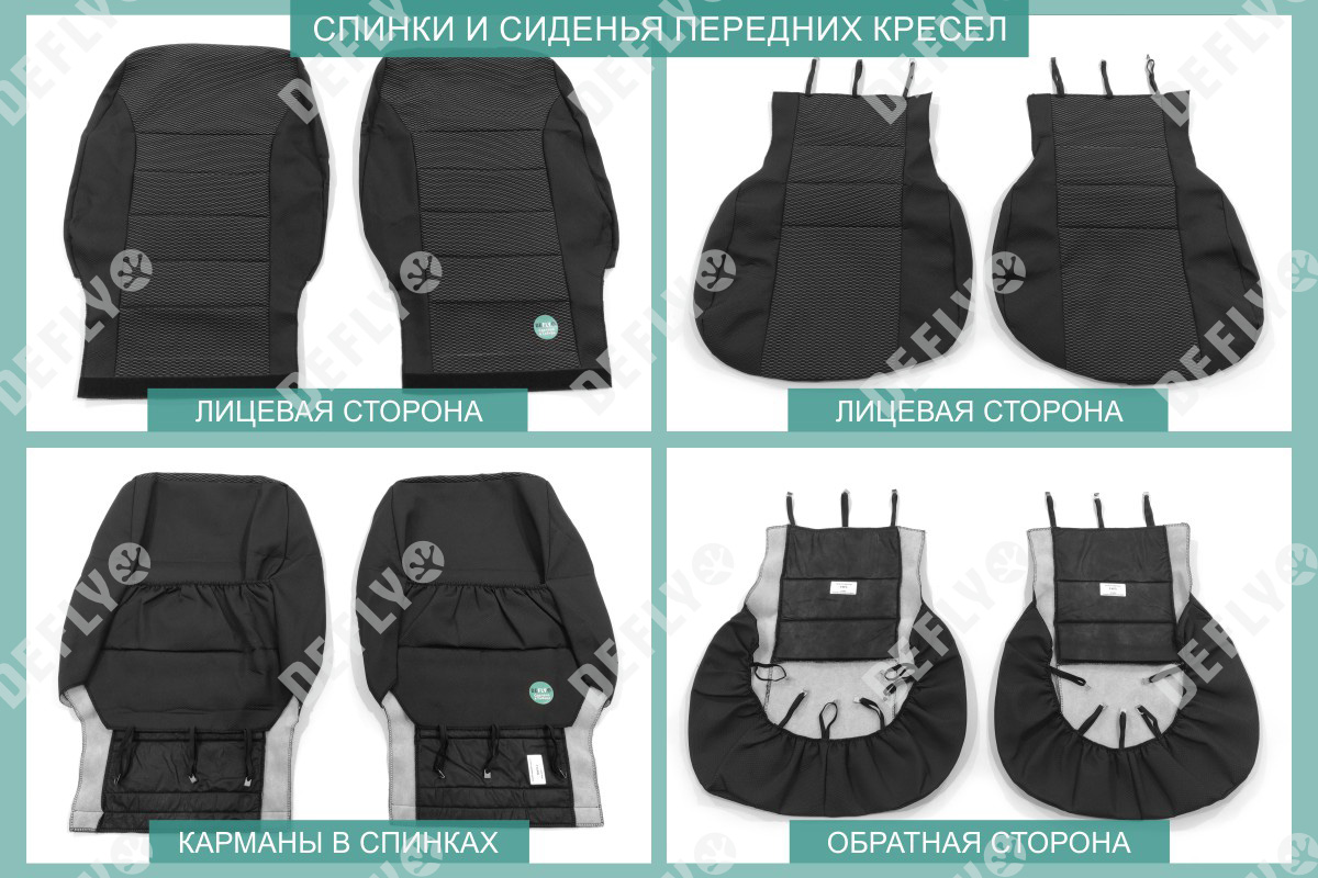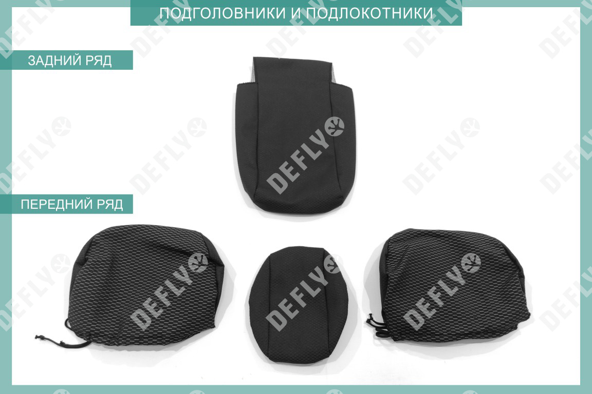 Материал: Жаккард, Цвет: Черный и темно-серый (оттенок и рисунок ткани может незначительно отличаться). Модельные чехлы от производителя “Defly” индивидуально сконструированы для каждого автомобиля. Изготовленные по лекалам оригинальных кресел, чехлы гарантируют идеальную посадку. В комплектацию входят детали всех элементов салона: передних кресел, заднего дивана, третьего ряда сидений, подголовников, подлокотников и т.д. Спинки передних кресел дополнены карманами. Все швы и технологические отверстия обработаны на оверлоке. Чехлы не ограничивают заводскую функциональность салона. Наличие в чехлах специального распускаемого шва не препятствует своевременному и полному раскрытию подушек безопасности. Специально разработанная система креплений позволяет надежно зафиксировать изделия. Авточехлы изготовлены из двух видов жаккарда: черного и темно-серого с рисунком. Подголовники, боковые и задние элементы выполнены из черного жаккарда. Центральные вставки сидений изготовлены из темно-серого жаккарда. Жаккард обеспечивает циркуляцию воздуха, что обеспечивает комфорт при длительных поездках. * Представленные фотографии являются примером исполнения и служат для демонстрации материалов и конструкции чехлов