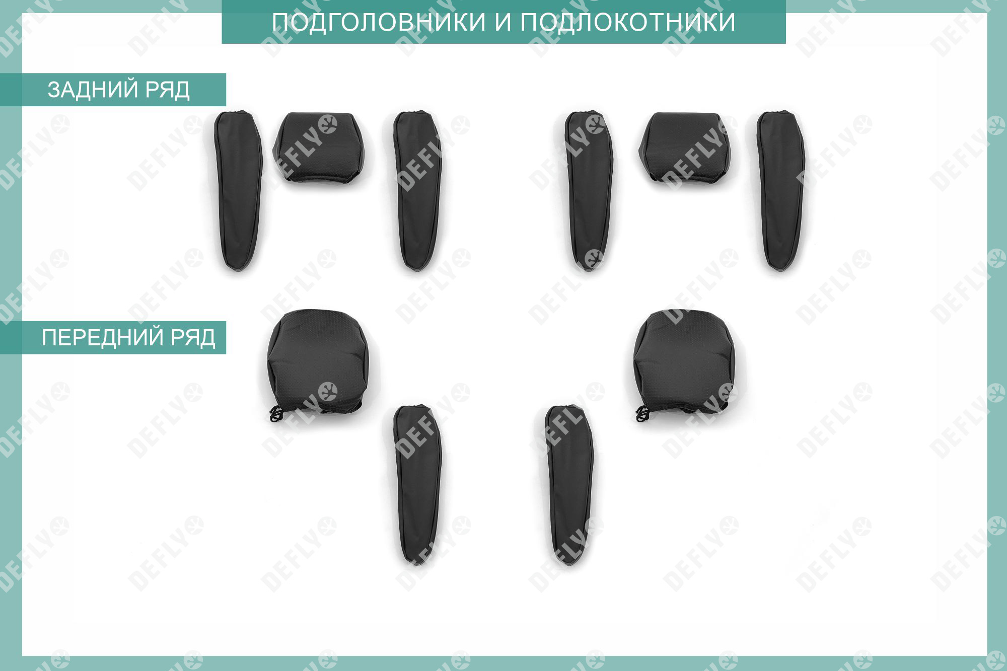 Первый ряд: Подголовник переднего кресла – 2 шт Спинка переднего кресла – 2 шт Сиденье переднего кресла – 2 шт Подлокотник переднего кресла левый – 1 шт Подлокотник переднего кресла правый – 1шт Второй ряд: Спинка дивана заднего ряда – 2 шт Сиденье дивана заднего ряда – 2 шт Подлокотник спинки заднего ряда – 2 шт Подлокотник заднего ряда – 2 шт Итого: 16 изделий