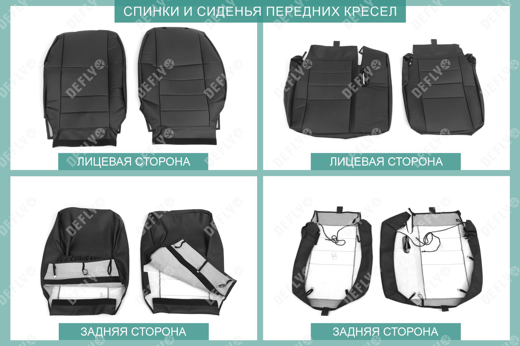 Материал: Экокожа гладкая, экокожа перфорированная, Цвет: Черный (оттенок ткани может незначительно отличаться). Модельные чехлы от производителя “Defly” индивидуально сконструированы для каждого автомобиля. Изготовленные по лекалам оригинальных кресел, чехлы гарантируют идеальную посадку. Все швы и технологические отверстия обработаны на оверлоке. Чехлы не ограничивают заводскую функциональность салона. Наличие в чехлах специального распускаемого шва не препятствует своевременному и полному раскрытию подушек безопасности. Специально разработанная система креплений позволяет надежно зафиксировать изделия. Авточехлы изготовлены из двух видов экокожи черного цвета: гладкой и перфорированной. Перфорированная экокожа используется в центральных элементах, что обеспечивает циркуляцию воздуха. * Представленные фотографии являются примером исполнения и служат для демонстрации материалов и конструкции чехлов.