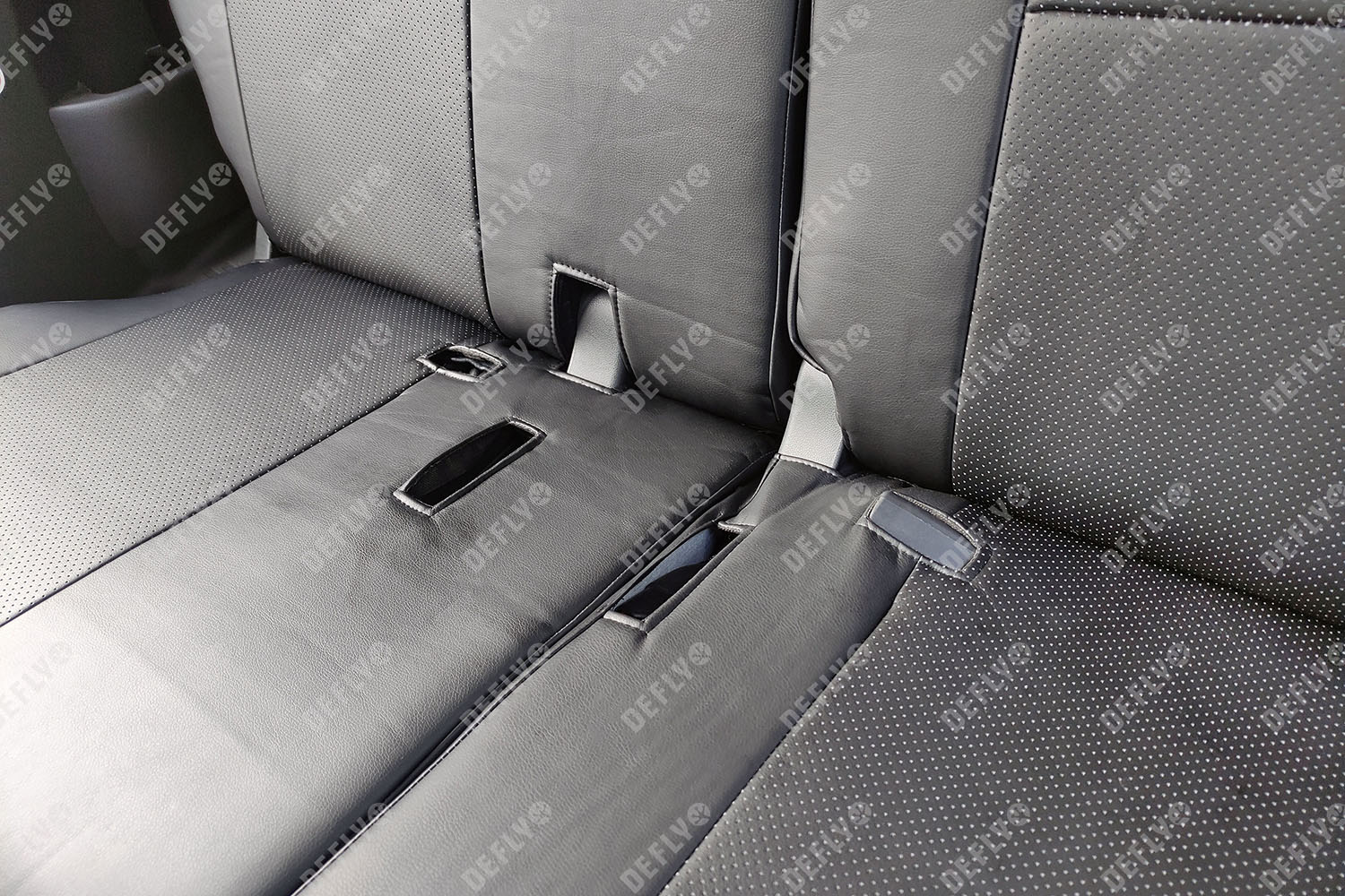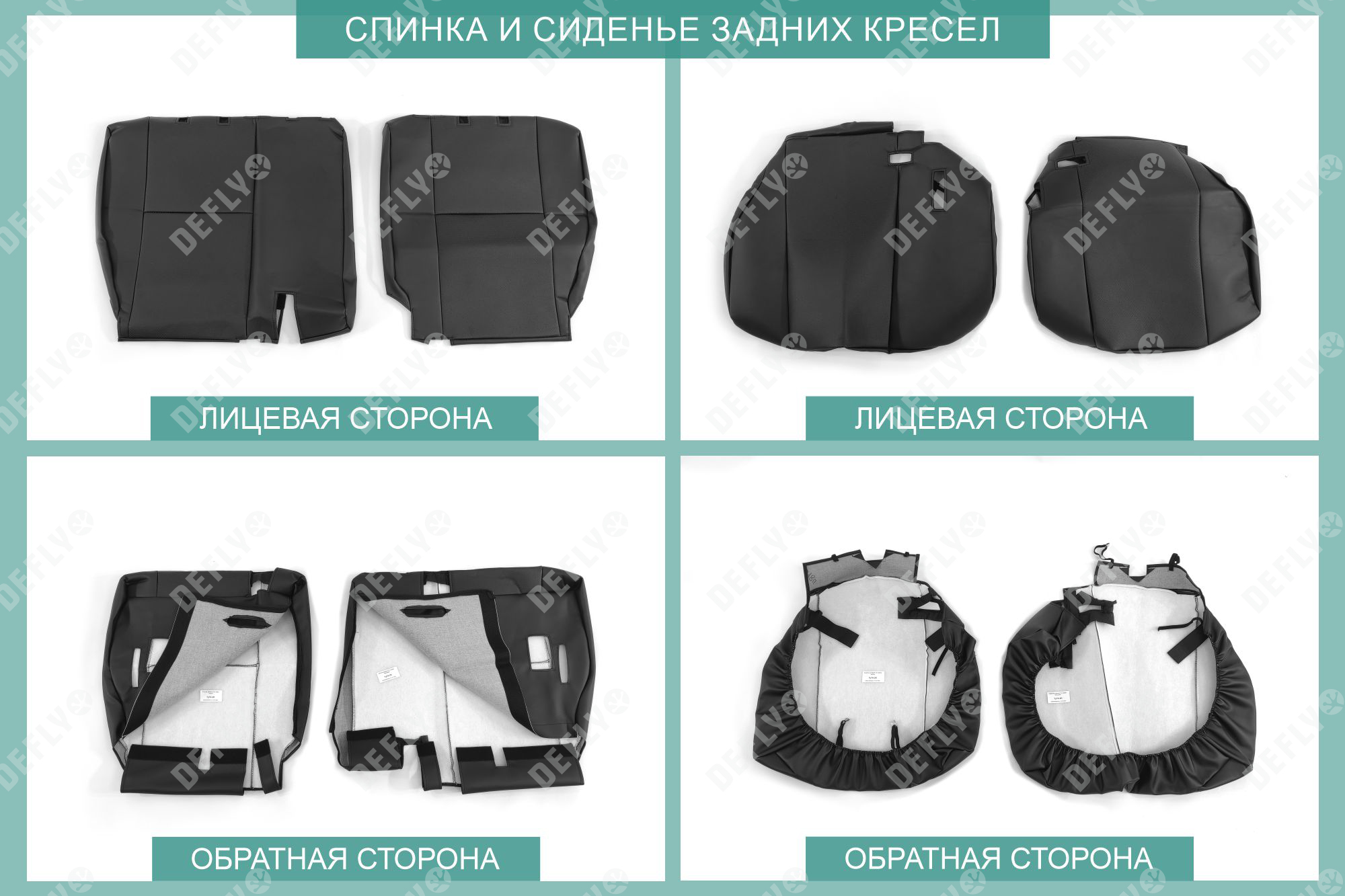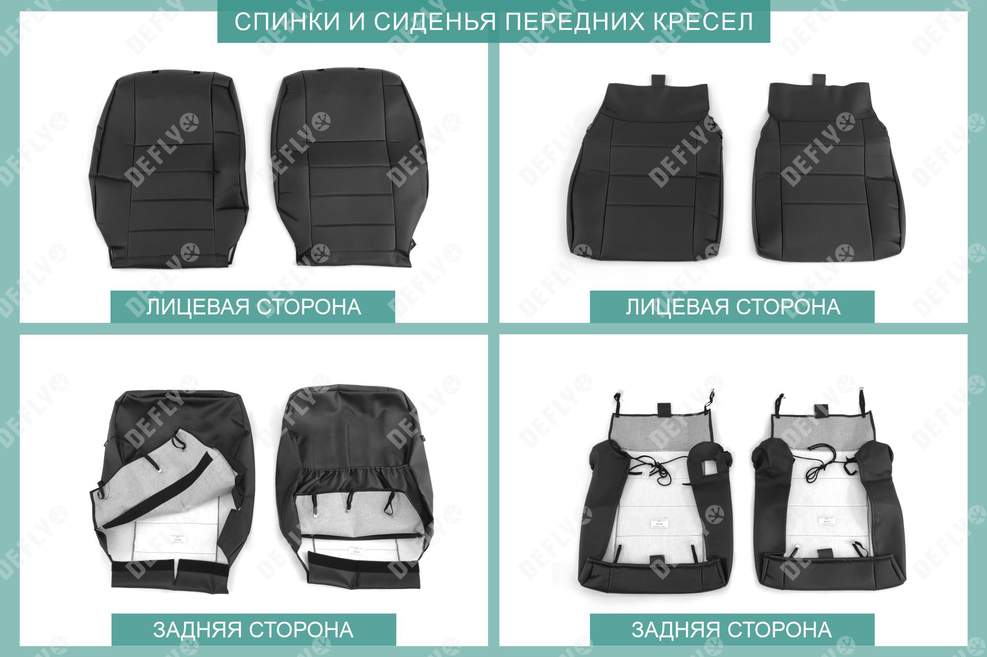 Материал: Экокожа гладкая, экокожа перфорированная, Цвет: Черный (оттенок ткани может незначительно отличаться). Модельные чехлы от производителя “Defly” индивидуально сконструированы для каждого автомобиля. Изготовленные по лекалам оригинальных кресел, чехлы гарантируют идеальную посадку. Все швы и технологические отверстия обработаны на оверлоке. Чехлы не ограничивают заводскую функциональность салона. Наличие в чехлах специального распускаемого шва не препятствует своевременному и полному раскрытию подушек безопасности. Специально разработанная система креплений позволяет надежно зафиксировать изделия. Авточехлы изготовлены из двух видов экокожи черного цвета: гладкой и перфорированной. Перфорированная экокожа используется в центральных элементах, что обеспечивает циркуляцию воздуха. * Представленные фотографии являются примером исполнения и служат для демонстрации материалов и конструкции чехлов.