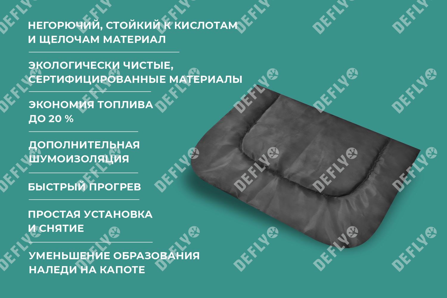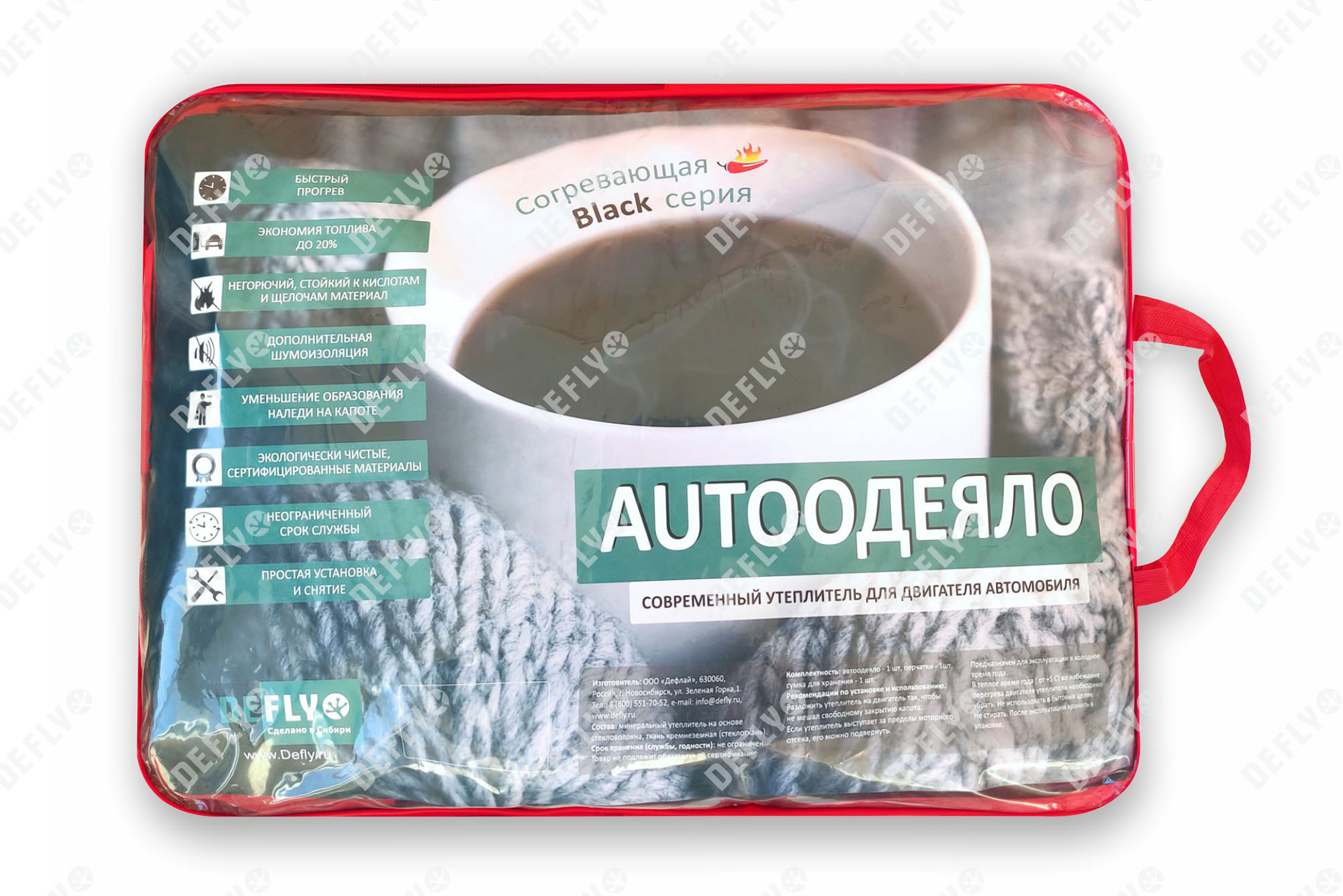 TEXT:Автоодеяло на двигатель серии Black от компании DEFLY – отличный выбор для теплоизоляции двигателя автомобиля в холодное время года. Графитовый цвет ткани придает автоодеялу эстетичный внешний вид, меньше заметны загрязнения, изделие дольше сохраняет опрятный внешний вид в течении всего срока эксплуатации. Автоодеяло, упакованное в стильную сумку для транспортировки и хранения, станет отличным подарком автовладельцу. Перчатки из комплекта помогут с комфортом установить утеплитель. С автоодеялом Вы сможете ускорить прогрев двигателя до рабочей температуры и защитить его даже в самое холодное время года (t° эксплуатации от - 5 °C до - 50 °C). Покупая наше автоодеяло, Вы экономите свои деньги и время, при этом получаете комфорт! Изделие произведено из высококачественных материалов, относящихся к группе негорючих (НГ). В наших одеялах используется: утеплитель минераловатный, марка URSA M-11, толщиной 50 мм и плотный материал верха - стеклоткань электоизоляционная. Автоодеяла выдерживают температуру до 550 °C. Благодаря мировым стандартам качества производства, используемые материалы не разрушаются во время эксплуатации, что исключает попадание частиц в воздушные фильтры двигателя автомобиля. Все компоненты являются не токсичными, экологически чистыми, устойчивыми к воздействию кислот и щелочей. Все материалы соответствуют требованиям пожаробезопасности, что подтверждается испытаниями в лабораториях Роспотребнадзора и сертификатами Соответствия РФ. Мы уверены в качестве наших изделий, поэтому DEFLY даёт гарантию на свою продукцию и предоставляет сервисное обслуживание своим клиентам. Вы можете быть уверены, что приобретаете товар, который прослужит вам долгие годы. * Использовать строго по назначению. Не использовать в теплое время года во избежание перегрева двигателя. Не стирать. Не использовать в бытовых целях. * Перед выбором размера автоодеяла необходимо произвести точные измерения подкапотного пространства вашего автомобиля.