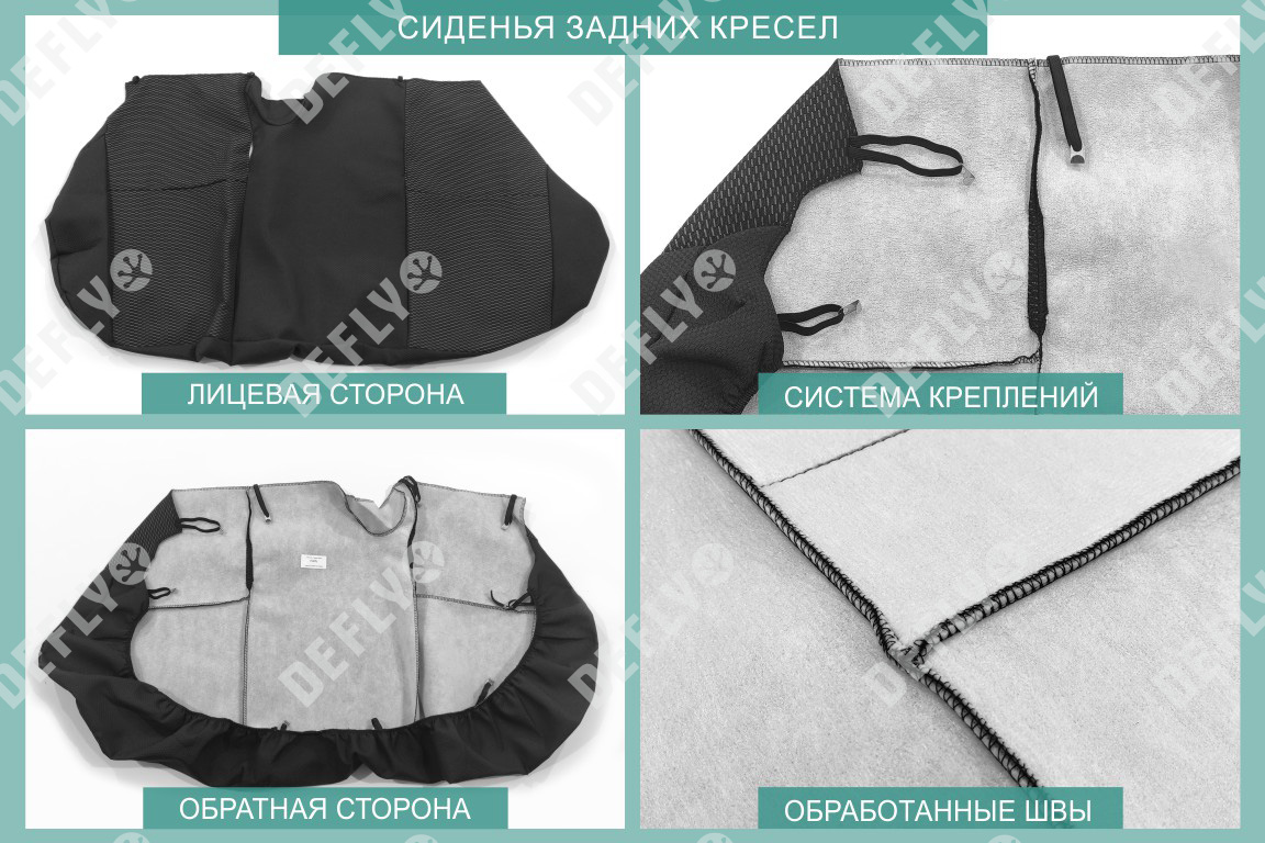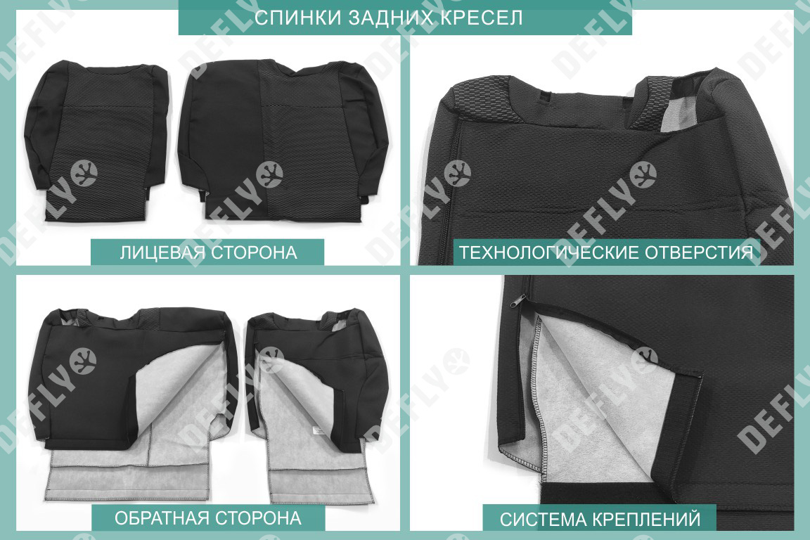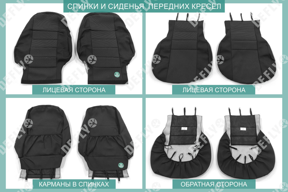 Материал: Жаккард, Цвет: Черный и темно-серый (оттенок и рисунок ткани может незначительно отличаться). Модельные чехлы от производителя “Defly” индивидуально сконструированы для каждого автомобиля. Изготовленные по лекалам оригинальных кресел, чехлы гарантируют идеальную посадку. В комплектацию входят детали всех элементов салона: передних кресел, заднего дивана, третьего ряда сидений, подголовников, подлокотников и т.д. Спинки передних кресел дополнены карманами. Все швы и технологические отверстия обработаны на оверлоке. Чехлы не ограничивают заводскую функциональность салона. Наличие в чехлах специального распускаемого шва не препятствует своевременному и полному раскрытию подушек безопасности. Специально разработанная система креплений позволяет надежно зафиксировать изделия. Авточехлы изготовлены из двух видов жаккарда: черного и темно-серого с рисунком. Подголовники, боковые и задние элементы выполнены из черного жаккарда. Центральные вставки сидений изготовлены из темно-серого жаккарда. Жаккард обеспечивает циркуляцию воздуха, что обеспечивает комфорт при длительных поездках. * Представленные фотографии являются примером исполнения и служат для демонстрации материалов и конструкции чехлов