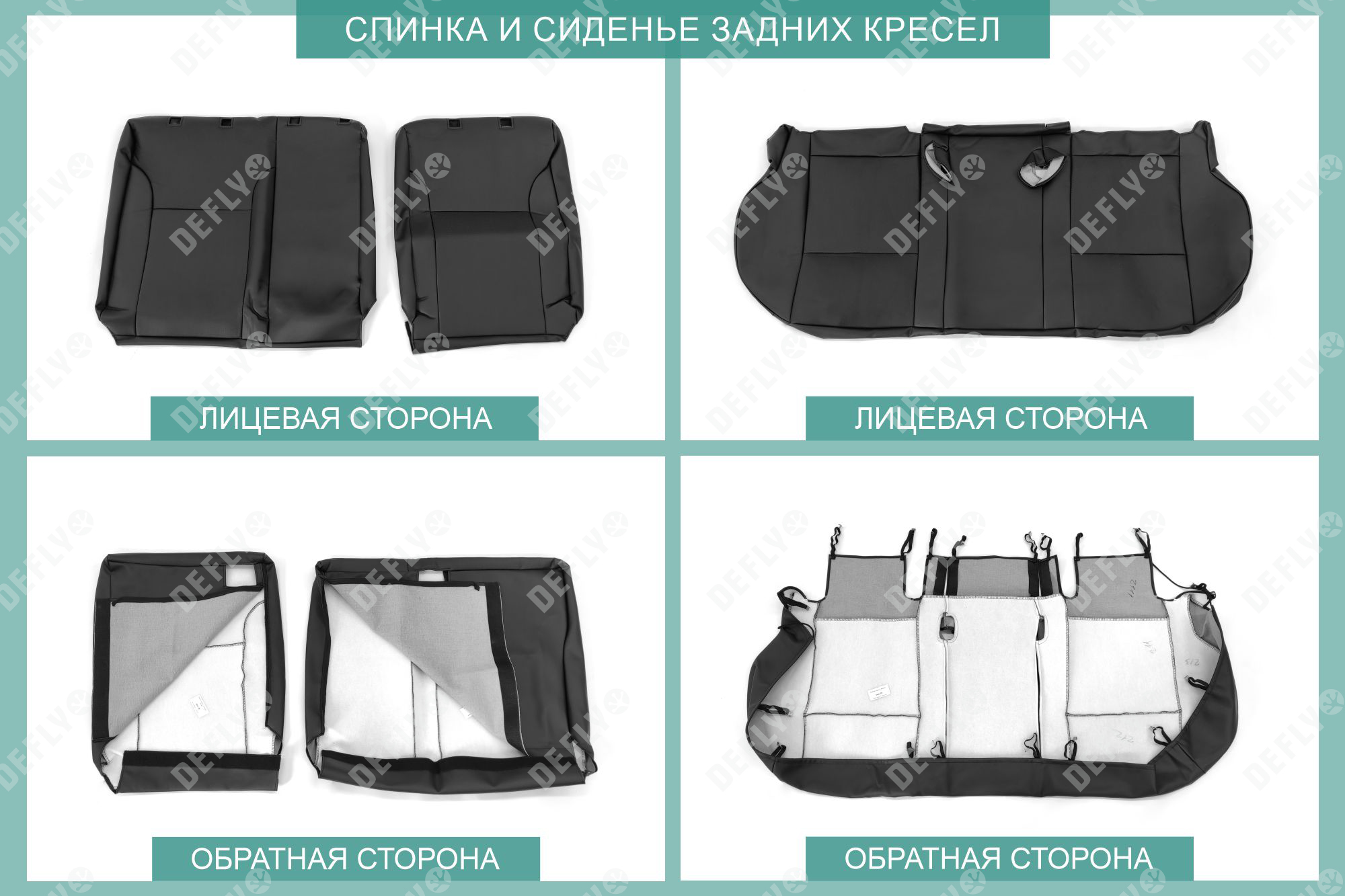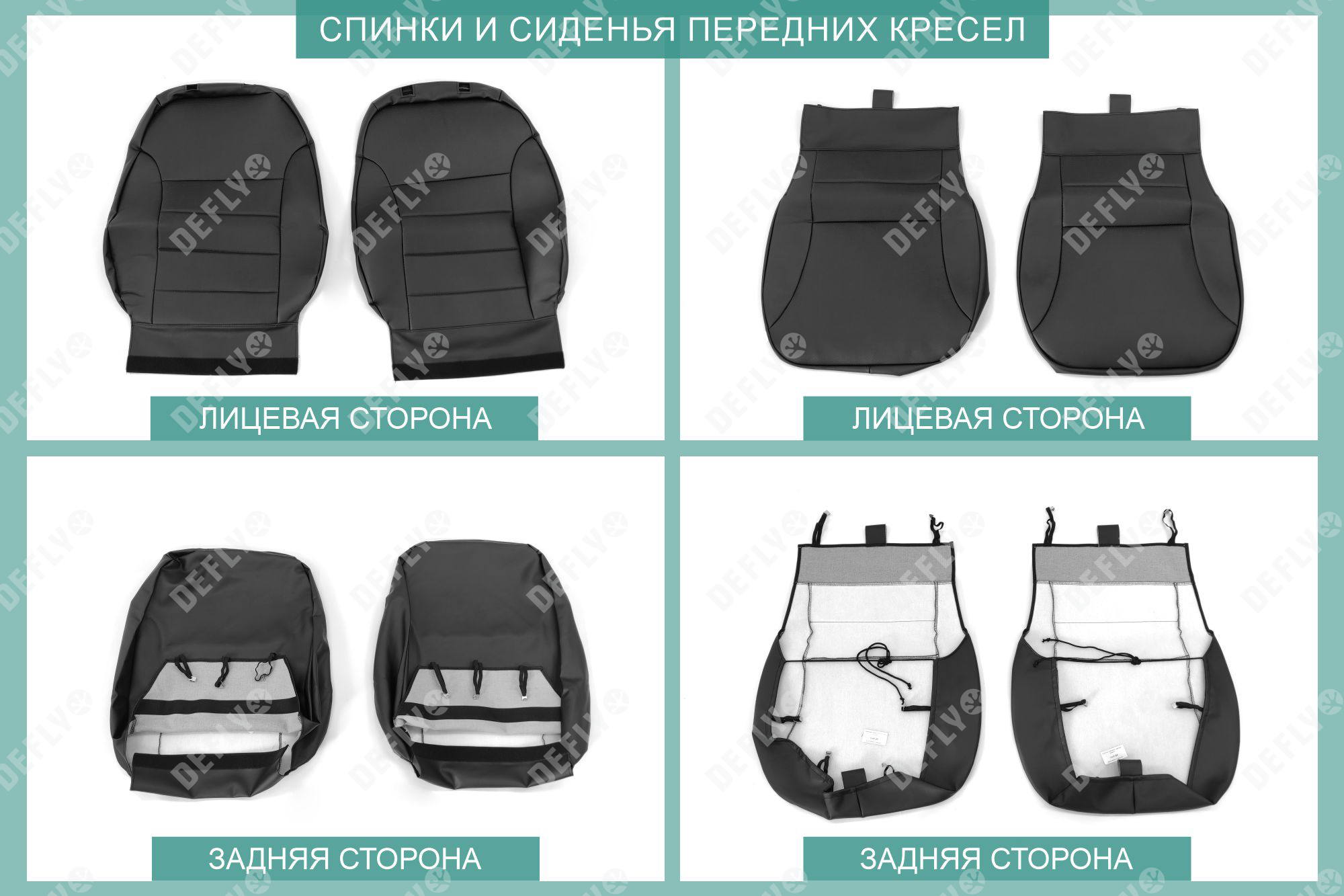 Материал: Экокожа гладкая, экокожа перфорированная, Цвет: Черный (оттенок ткани может незначительно отличаться). Модельные чехлы от производителя “Defly” индивидуально сконструированы для каждого автомобиля. Изготовленные по лекалам оригинальных кресел, чехлы гарантируют идеальную посадку. Все швы и технологические отверстия обработаны на оверлоке. Чехлы не ограничивают заводскую функциональность салона. Наличие в чехлах специального распускаемого шва не препятствует своевременному и полному раскрытию подушек безопасности. Специально разработанная система креплений позволяет надежно зафиксировать изделия. Авточехлы изготовлены из двух видов экокожи черного цвета: гладкой и перфорированной. Перфорированная экокожа используется в центральных элементах, что обеспечивает циркуляцию воздуха. * Представленные фотографии являются примером исполнения и служат для демонстрации материалов и конструкции чехлов.