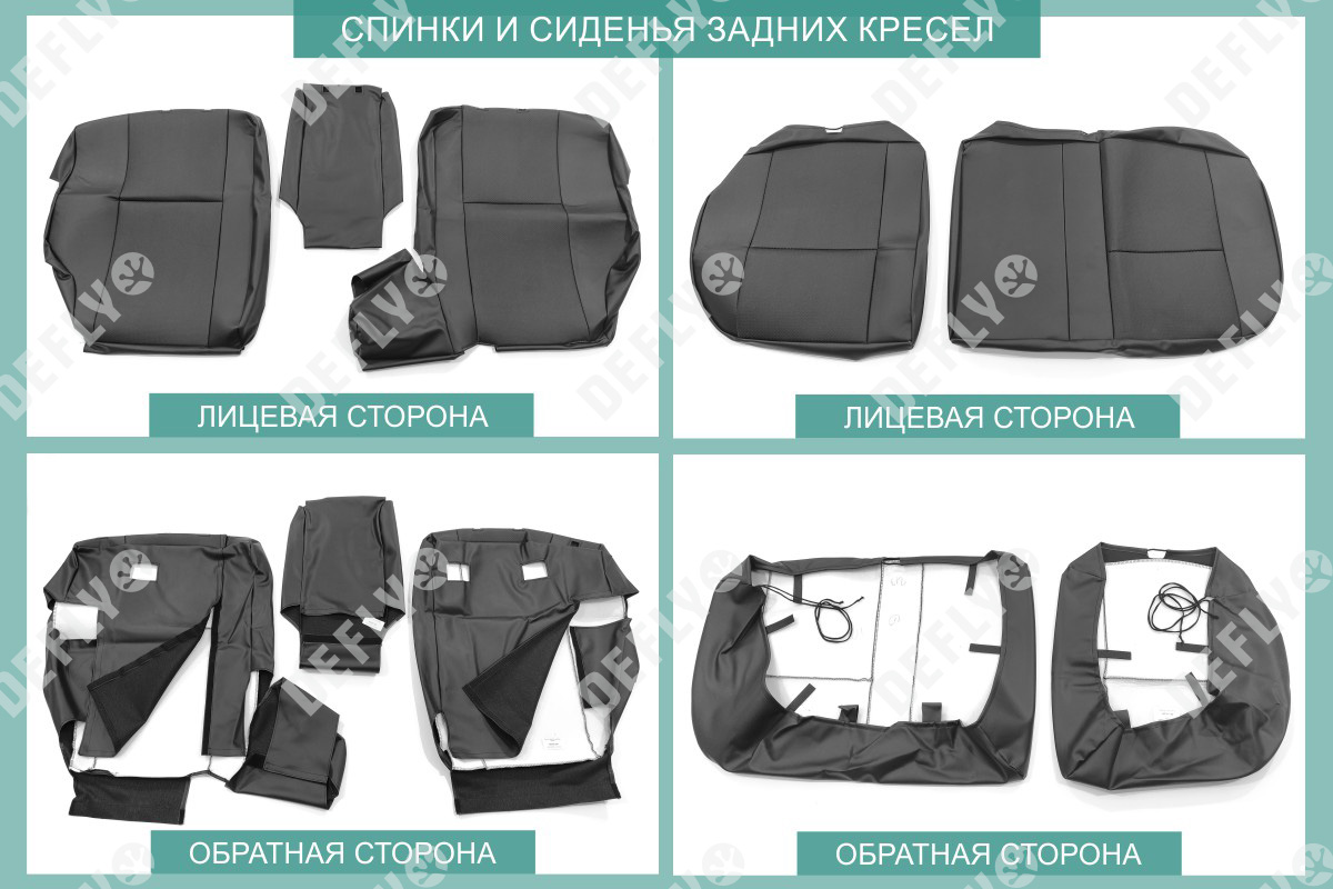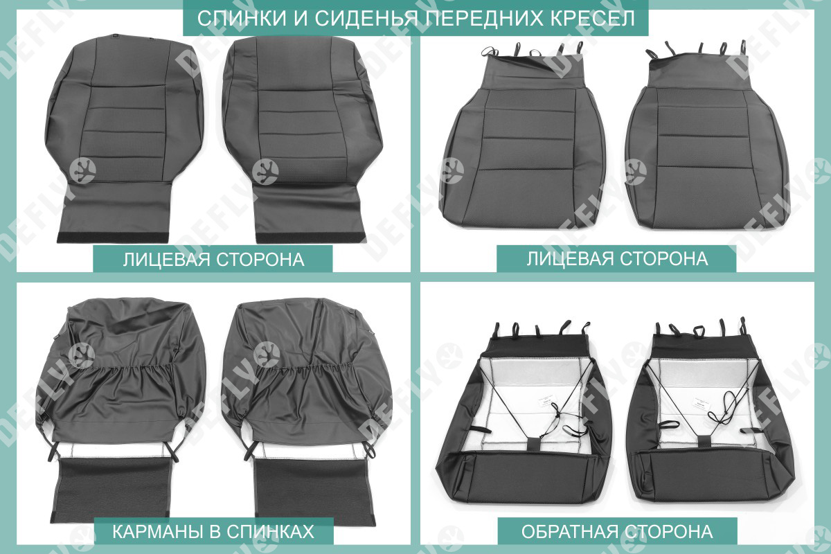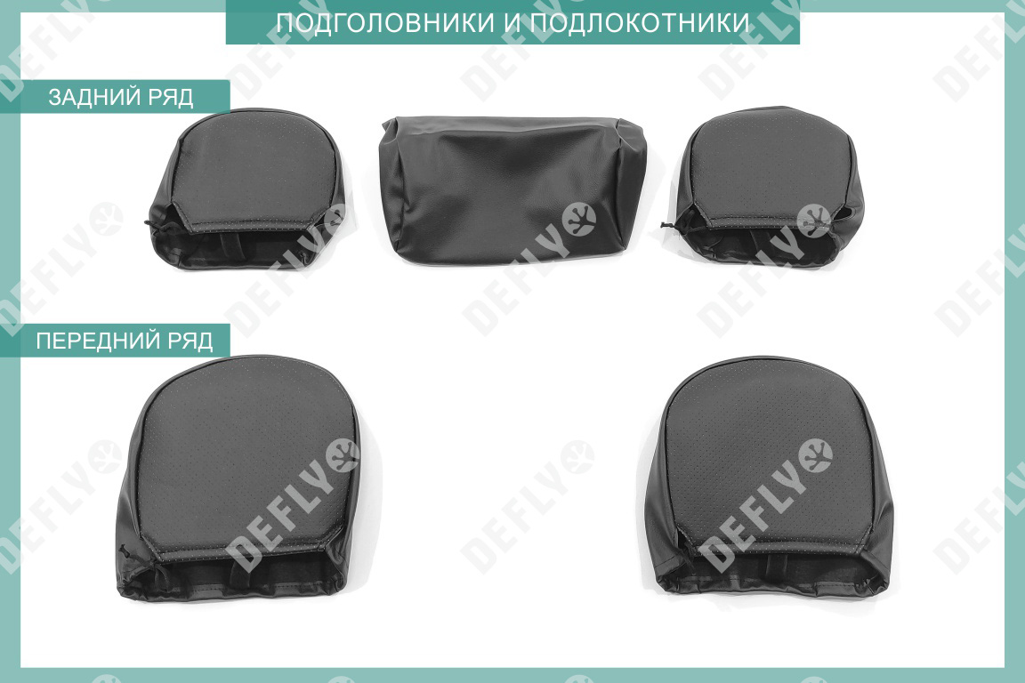 Материал: Экокожа гладкая, экокожа перфорированная, Цвет: Черный (оттенок ткани может незначительно отличаться). Модельные чехлы от производителя “Defly” индивидуально сконструированы для каждого автомобиля. Изготовленные по лекалам оригинальных кресел, чехлы гарантируют идеальную посадку. В комплектацию входят детали всех элементов салона: передних кресел, заднего дивана, третьего ряда сидений, подголовников, подлокотников и т.д. Спинки передних кресел дополнены карманами. Все швы и технологические отверстия обработаны на оверлоке. Чехлы не ограничивают заводскую функциональность салона. Наличие в чехлах специального распускаемого шва не препятствует своевременному и полному раскрытию подушек безопасности. Специально разработанная система креплений позволяет надежно зафиксировать изделия. Авточехлы изготовлены из двух видов экокожи черного цвета: гладкой и перфорированной. Перфорированная экокожа используется в центральных элементах, что обеспечивает циркуляцию воздуха. * Представленные фотографии являются примером исполнения и служат для демонстрации материалов и конструкции чехлов.