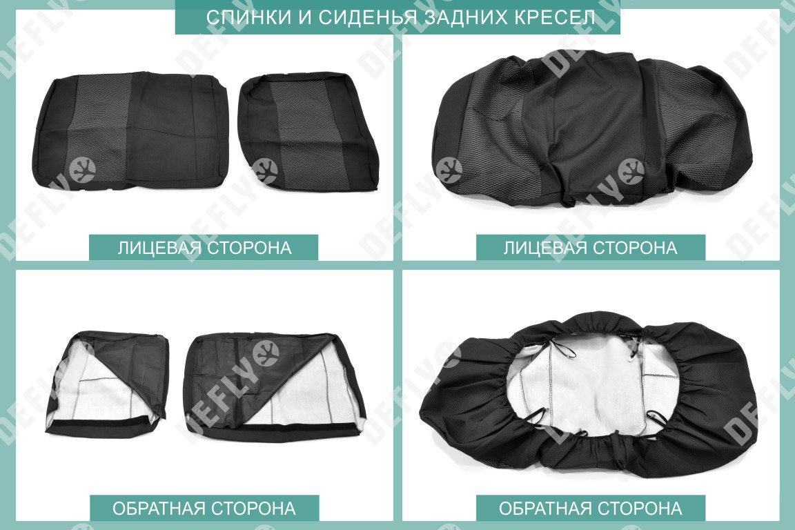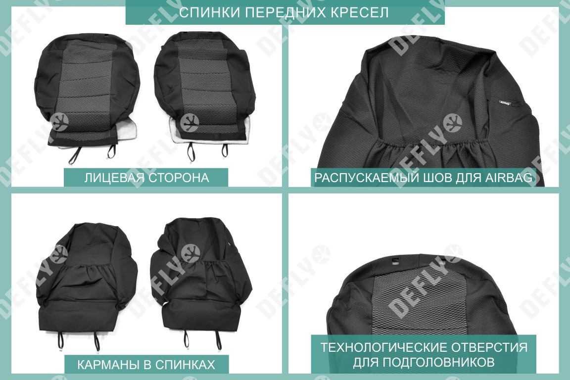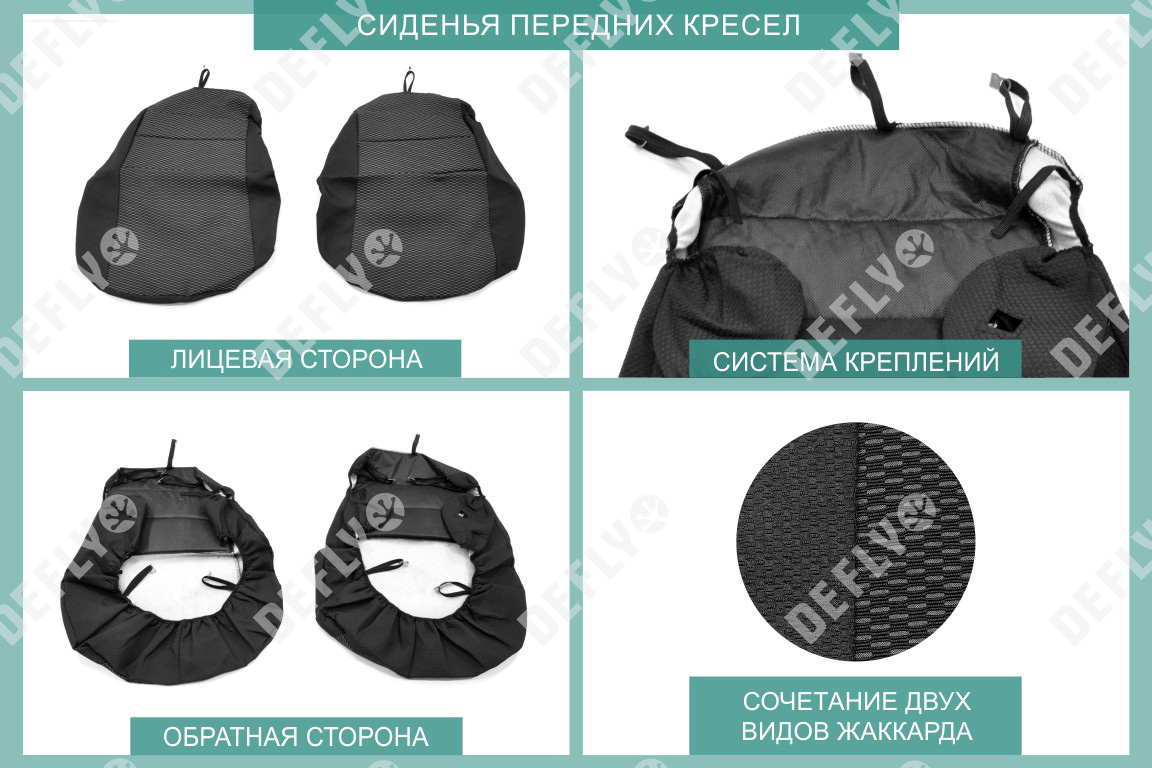 Материал: Жаккард, Цвет: Черный и темно-серый (оттенок и рисунок ткани может незначительно отличаться). Модельные чехлы от производителя “Defly” индивидуально сконструированы для каждого автомобиля. Изготовленные по лекалам оригинальных кресел, чехлы гарантируют идеальную посадку. В комплектацию входят детали всех элементов салона: передних кресел, заднего дивана, третьего ряда сидений, подголовников, подлокотников и т.д. Спинки передних кресел дополнены карманами. Все швы и технологические отверстия обработаны на оверлоке. Чехлы не ограничивают заводскую функциональность салона. Наличие в чехлах специального распускаемого шва не препятствует своевременному и полному раскрытию подушек безопасности. Специально разработанная система креплений позволяет надежно зафиксировать изделия. Авточехлы изготовлены из двух видов жаккарда: черного и темно-серого с рисунком. Подголовники, боковые и задние элементы выполнены из черного жаккарда. Центральные вставки сидений изготовлены из темно-серого жаккарда. Жаккард обеспечивает циркуляцию воздуха, что обеспечивает комфорт при длительных поездках. * Представленные фотографии являются примером исполнения и служат для демонстрации материалов и конструкции чехлов