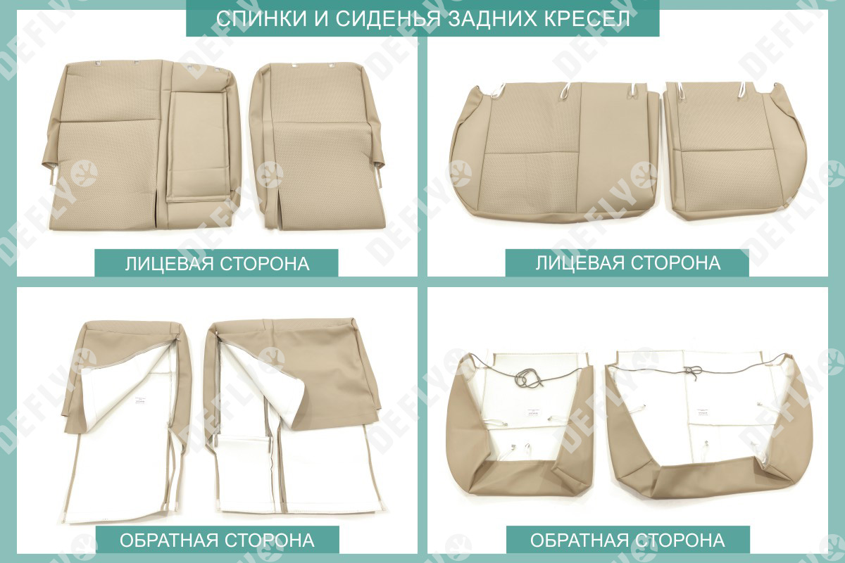 Материал: Экокожа гладкая, экокожа перфорированная, Цвет: Бежевый (оттенок ткани может незначительно отличаться). Модельные чехлы от производителя “Defly” индивидуально сконструированы для каждого автомобиля. Изготовленные по лекалам оригинальных кресел, чехлы гарантируют идеальную посадку. В комплектацию входят детали всех элементов салона: передних кресел, заднего дивана, третьего ряда сидений, подголовников, подлокотников и т.д. Спинки передних кресел дополнены карманами. Все швы и технологические отверстия обработаны на оверлоке. Чехлы не ограничивают заводскую функциональность салона. Наличие в чехлах специального распускаемого шва не препятствует своевременному и полному раскрытию подушек безопасности. Специально разработанная система креплений позволяет надежно зафиксировать изделия. Авточехлы изготовлены из двух видов экокожи бежевого цвета: гладкой и перфорированной. Перфорированная экокожа используется в центральных элементах, что обеспечивает циркуляцию воздуха. * Представленные фотографии являются примером исполнения и служат для демонстрации материалов и конструкции чехлов