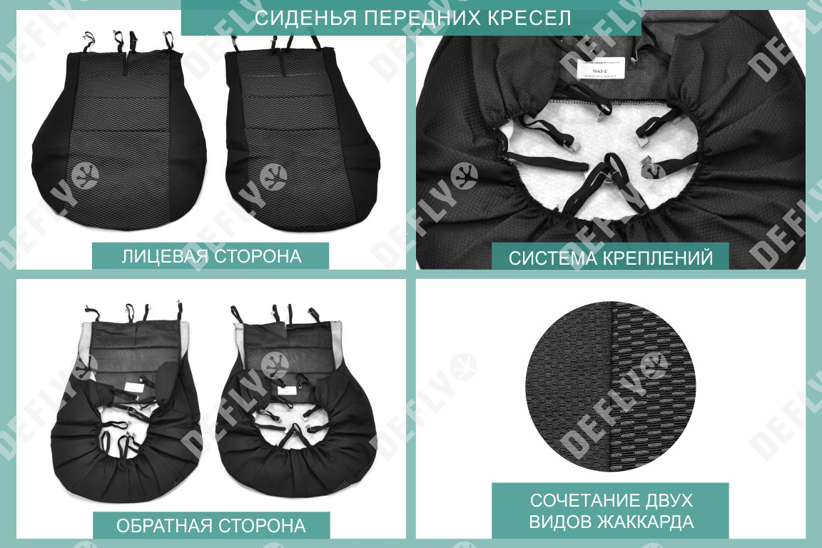 Материал: Жаккард, Цвет: Черный и темно-серый (оттенок и рисунок ткани может незначительно отличаться). Модельные чехлы от производителя “Defly” индивидуально сконструированы для каждого автомобиля. Изготовленные по лекалам оригинальных кресел, чехлы гарантируют идеальную посадку. В комплектацию входят детали всех элементов салона: передних кресел, заднего дивана, третьего ряда сидений, подголовников, подлокотников и т.д. Спинки передних кресел дополнены карманами. Все швы и технологические отверстия обработаны на оверлоке. Чехлы не ограничивают заводскую функциональность салона. Наличие в чехлах специального распускаемого шва не препятствует своевременному и полному раскрытию подушек безопасности. Специально разработанная система креплений позволяет надежно зафиксировать изделия. Авточехлы изготовлены из двух видов жаккарда: черного и темно-серого с рисунком. Подголовники, боковые и задние элементы выполнены из черного жаккарда. Центральные вставки сидений изготовлены из темно-серого жаккарда. Жаккард обеспечивает циркуляцию воздуха, что обеспечивает комфорт при длительных поездках. * Представленные фотографии являются примером исполнения и служат для демонстрации материалов и конструкции чехлов