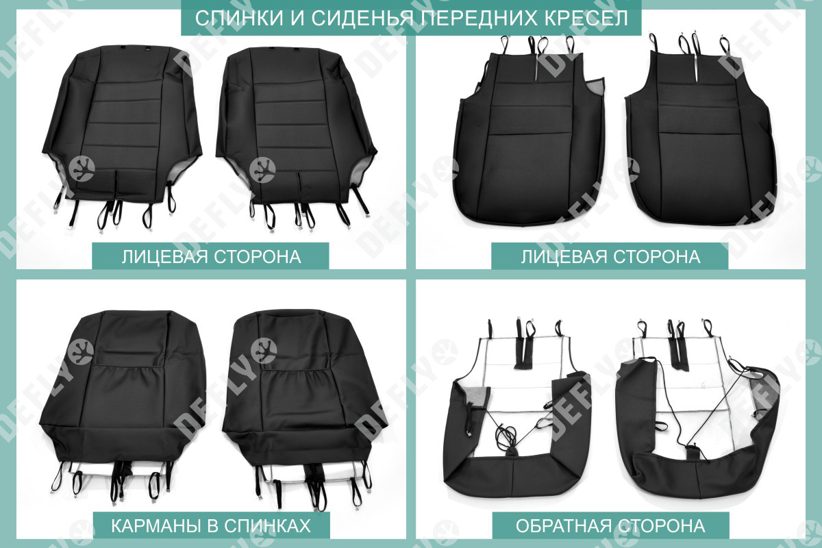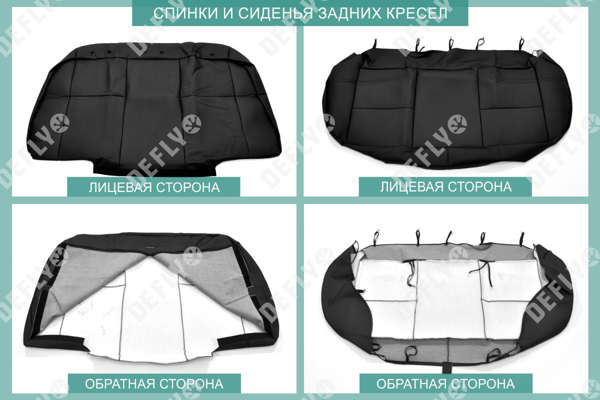 Материал: Экокожа гладкая, экокожа перфорированная, Цвет: Черный (оттенок ткани может незначительно отличаться). Модельные чехлы от производителя “Defly” индивидуально сконструированы для каждого автомобиля. Изготовленные по лекалам оригинальных кресел, чехлы гарантируют идеальную посадку. Все швы и технологические отверстия обработаны на оверлоке. Чехлы не ограничивают заводскую функциональность салона. Наличие в чехлах специального распускаемого шва не препятствует своевременному и полному раскрытию подушек безопасности. Специально разработанная система креплений позволяет надежно зафиксировать изделия. Авточехлы изготовлены из двух видов экокожи черного цвета: гладкой и перфорированной. Перфорированная экокожа используется в центральных элементах, что обеспечивает циркуляцию воздуха. * Представленные фотографии являются примером исполнения и служат для демонстрации материалов и конструкции чехлов.