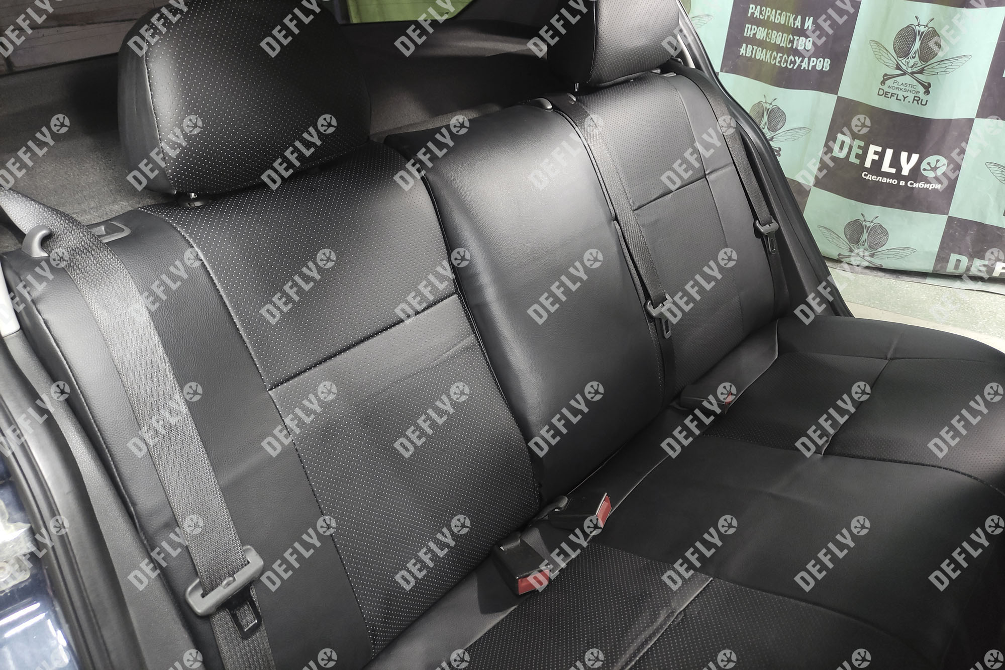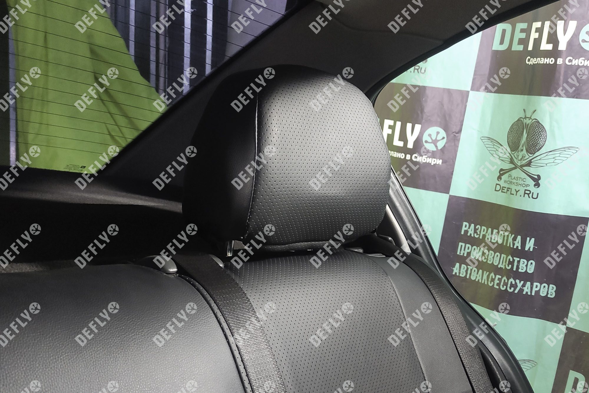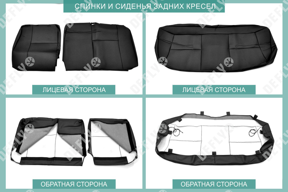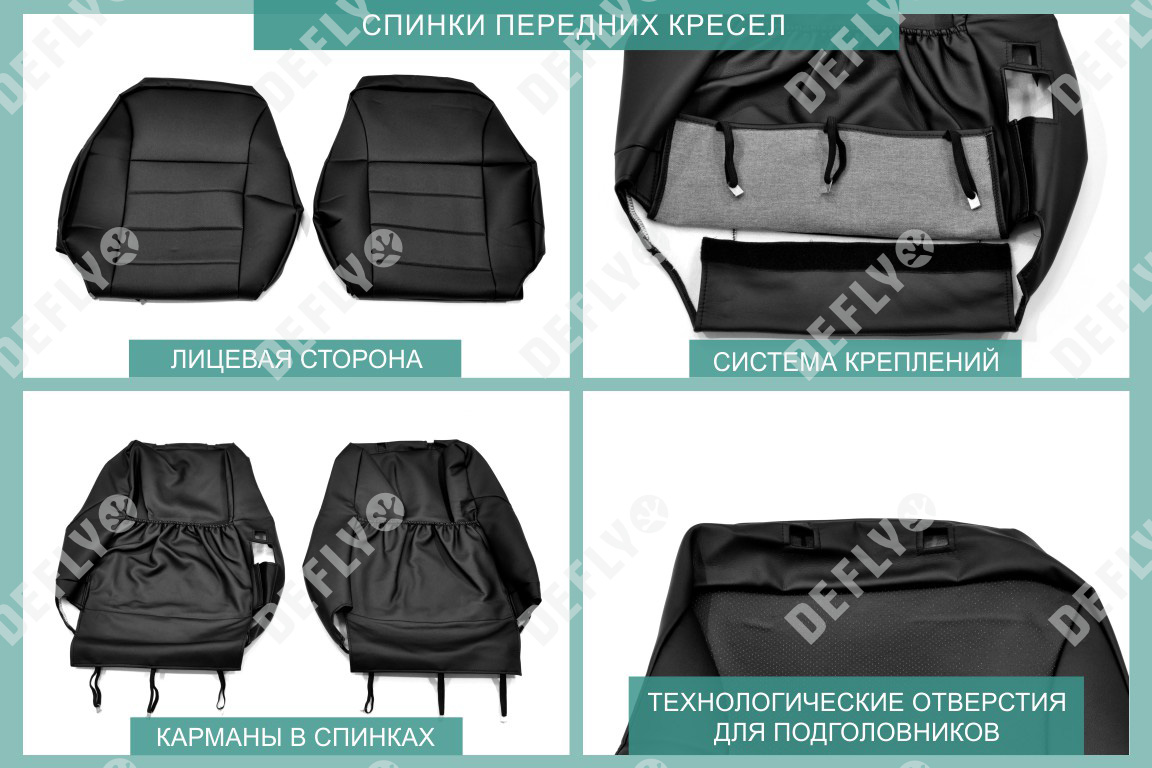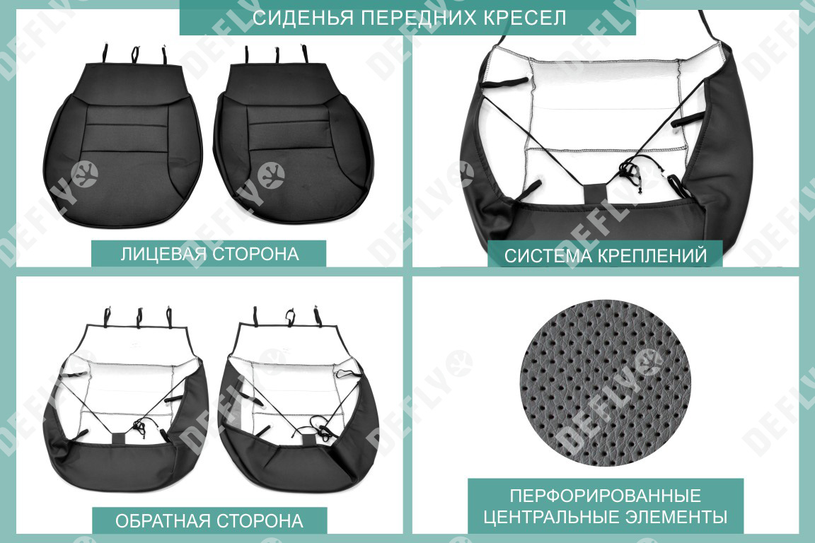 Материал: Экокожа гладкая, экокожа перфорированная, Цвет: Черный (оттенок ткани может незначительно отличаться). Модельные чехлы от производителя “Defly” индивидуально сконструированы для каждого автомобиля. Изготовленные по лекалам оригинальных кресел, чехлы гарантируют идеальную посадку. Все швы и технологические отверстия обработаны на оверлоке. Чехлы не ограничивают заводскую функциональность салона. Наличие в чехлах специального распускаемого шва не препятствует своевременному и полному раскрытию подушек безопасности. Специально разработанная система креплений позволяет надежно зафиксировать изделия. Авточехлы изготовлены из двух видов экокожи черного цвета: гладкой и перфорированной. Перфорированная экокожа используется в центральных элементах, что обеспечивает циркуляцию воздуха. * Представленные фотографии являются примером исполнения и служат для демонстрации материалов и конструкции чехлов.