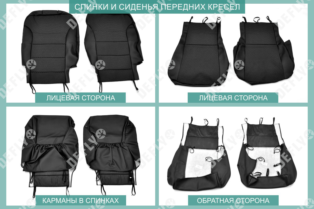 Материал: Экокожа гладкая, жаккард, Цвет: Черный и темно-серый (оттенок ткани может незначительно отличаться). Модельные чехлы от производителя “Defly” индивидуально сконструированы для каждого автомобиля. Изготовленные по лекалам оригинальных кресел, чехлы гарантируют идеальную посадку. В комплектацию входят детали всех элементов салона: передних кресел, заднего дивана, третьего ряда сидений, подголовников, подлокотников и т.д. Спинки передних кресел дополнены карманами. Все швы и технологические отверстия обработаны на оверлоке. Чехлы не ограничивают заводскую функциональность салона. Наличие в чехлах специального распускаемого шва не препятствует своевременному и полному раскрытию подушек безопасности. Специально разработанная система креплений позволяет надежно зафиксировать изделия. В комбинированных чехлах этой серии подголовники, боковые и задние элементы выполнены из черной экокожи, а центральные вставки сидений изготовлены из темно-серого жаккарда. Жаккардовые вставки обеспечивают циркуляцию воздуха, что обеспечивает комфорт при длительных поездках. * Представленные фотографии являются примером исполнения и служат для демонстрации материалов и конструкции чехлов.