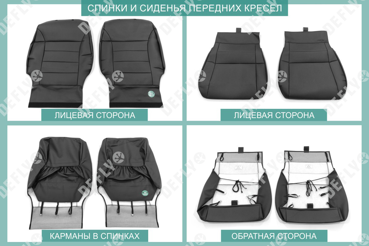 Материал: Экокожа гладкая, экокожа перфорированная, Цвет: Черный (оттенок ткани может незначительно отличаться). Модельные чехлы от производителя “Defly” индивидуально сконструированы для каждого автомобиля. Изготовленные по лекалам оригинальных кресел, чехлы гарантируют идеальную посадку. В комплектацию входят детали всех элементов салона: передних кресел, заднего дивана, третьего ряда сидений, подголовников, подлокотников и т.д. Спинки передних кресел дополнены карманами. Все швы и технологические отверстия обработаны на оверлоке. Чехлы не ограничивают заводскую функциональность салона. Наличие в чехлах специального распускаемого шва не препятствует своевременному и полному раскрытию подушек безопасности. Специально разработанная система креплений позволяет надежно зафиксировать изделия. Авточехлы изготовлены из двух видов экокожи черного цвета: гладкой и перфорированной. Перфорированная экокожа используется в центральных элементах, что обеспечивает циркуляцию воздуха. * Представленные фотографии являются примером исполнения и служат для демонстрации материалов и конструкции чехлов.