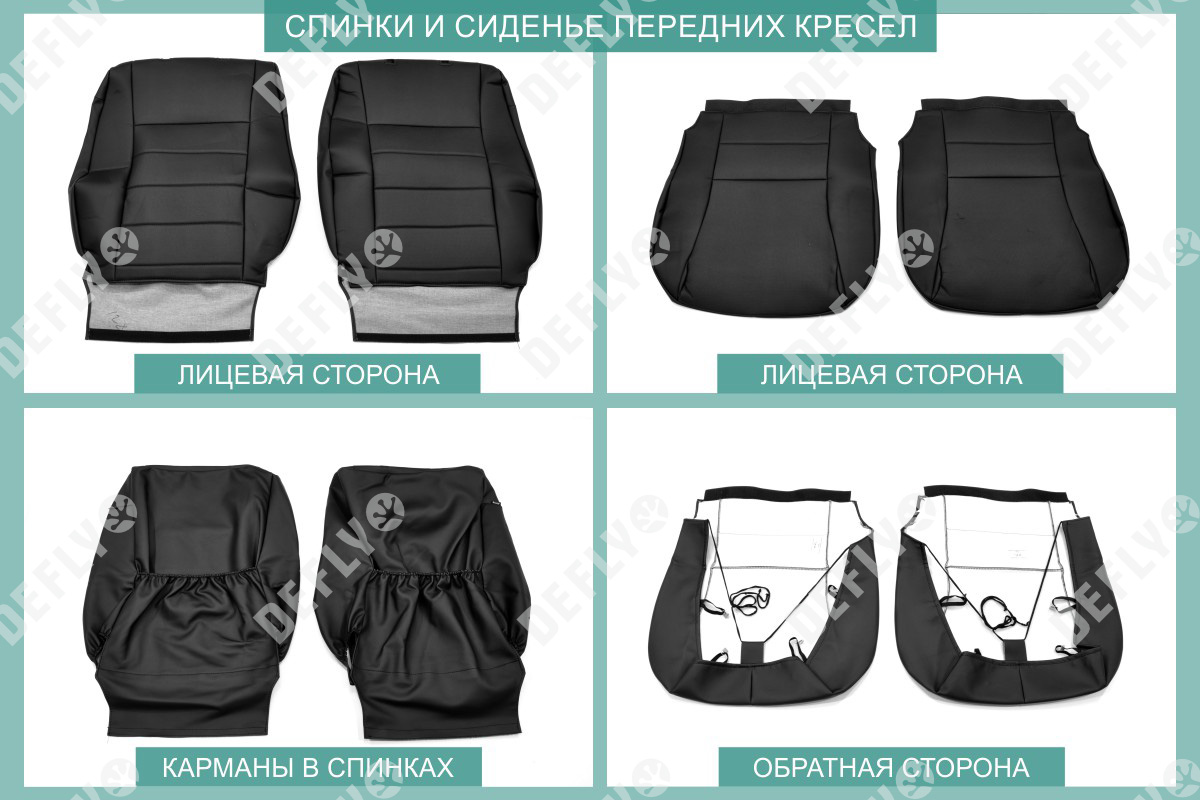 Материал: Экокожа гладкая, экокожа перфорированная, Цвет: Черный (оттенок ткани может незначительно отличаться). Модельные чехлы от производителя “Defly” индивидуально сконструированы для каждого автомобиля. Изготовленные по лекалам оригинальных кресел, чехлы гарантируют идеальную посадку. Все швы и технологические отверстия обработаны на оверлоке. Чехлы не ограничивают заводскую функциональность салона. Наличие в чехлах специального распускаемого шва не препятствует своевременному и полному раскрытию подушек безопасности. Специально разработанная система креплений позволяет надежно зафиксировать изделия. Авточехлы изготовлены из двух видов экокожи черного цвета: гладкой и перфорированной. Перфорированная экокожа используется в центральных элементах, что обеспечивает циркуляцию воздуха. * Представленные фотографии являются примером исполнения и служат для демонстрации материалов и конструкции чехлов.