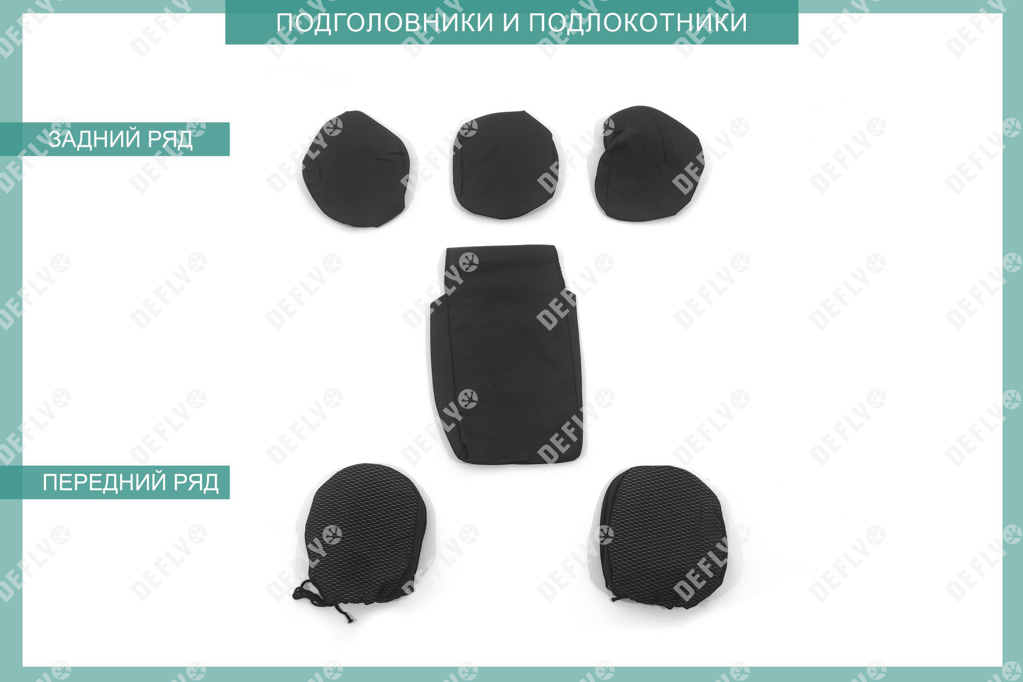 Первый ряд: Подголовник переднего кресла – 2 шт Спинка переднего кресла - 2 шт Сиденье переднего кресла – 2 шт Второй ряд: Подголовник заднего ряда – 2 шт Подголовник заднего ряда центральный – 1 шт Спинка дивана заднего ряда большая – 1 шт Спинка дивана заднего ряда малая – 1 шт Сиденье дивана заднего ряда - 1 шт Подлокотник заднего ряда – 1 шт Итого: 13 изделий