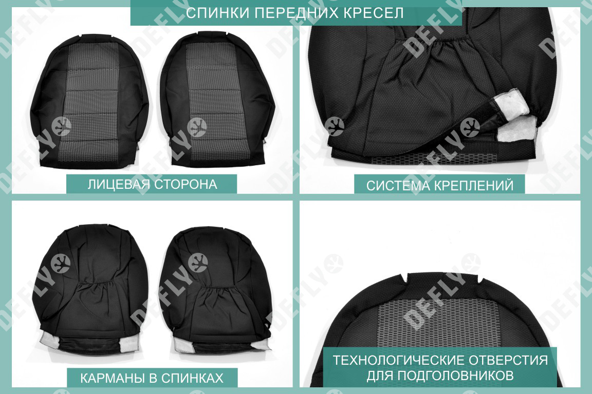 Материал: Жаккард, Цвет: Черный и темно-серый (оттенок и рисунок ткани может незначительно отличаться). Модельные чехлы от производителя “Defly” индивидуально сконструированы для каждого автомобиля. Изготовленные по лекалам оригинальных кресел, чехлы гарантируют идеальную посадку. В комплектацию входят детали всех элементов салона: передних кресел, заднего дивана, третьего ряда сидений, подголовников, подлокотников и т.д. Спинки передних кресел дополнены карманами. Все швы и технологические отверстия обработаны на оверлоке. Чехлы не ограничивают заводскую функциональность салона. Наличие в чехлах специального распускаемого шва не препятствует своевременному и полному раскрытию подушек безопасности. Специально разработанная система креплений позволяет надежно зафиксировать изделия. Авточехлы изготовлены из двух видов жаккарда: черного и темно-серого с рисунком. Подголовники, боковые и задние элементы выполнены из черного жаккарда. Центральные вставки сидений изготовлены из темно-серого жаккарда. Жаккард обеспечивает циркуляцию воздуха, что обеспечивает комфорт при длительных поездках. * Представленные фотографии являются примером исполнения и служат для демонстрации материалов и конструкции чехлов