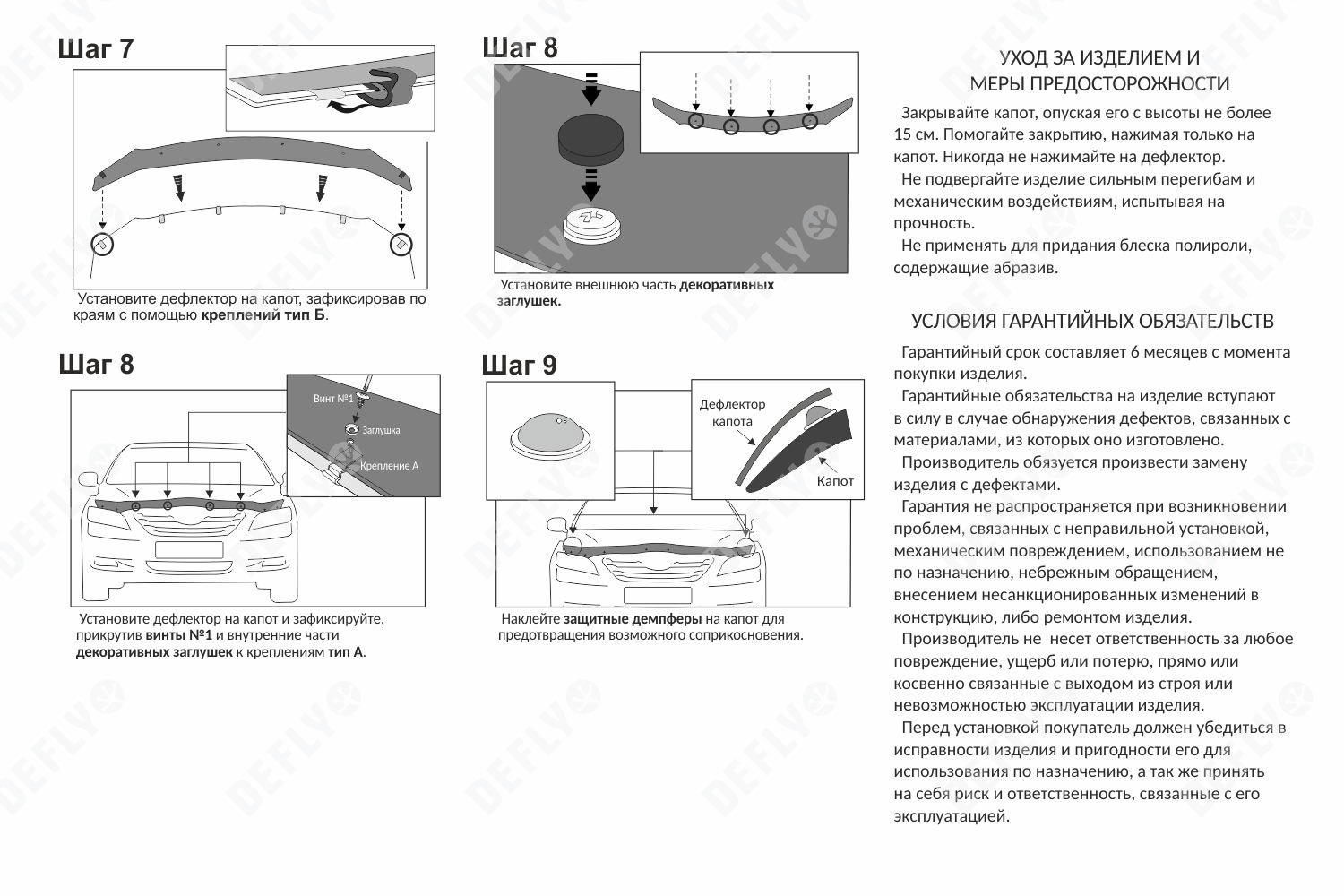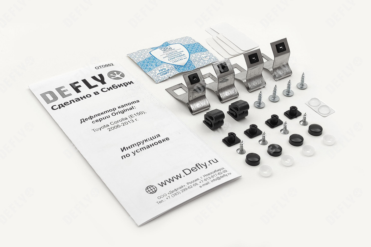 Дефлекторы капота от производителя “Defly” cерии «Original» минимально влияют на аэродинамические характеристики автомобиля и органично вписывается в его дизайн. Ребро жесткости, созданное загибом передней части дефлектора, увеличивает прочность конструкции и надежно защищает край капота от сколов. Уникальные системы креплений серии «Original» разрабатываются индивидуально для каждой модели автомобиля. Максимально надежная фиксация дефлектора обеспечивается за счет установки пластиковых клипс в штатные места, с внутренней стороны капота, и дополнительных фиксаторов по краю изделия. Дополнительные демпферы предотвращают вибрации дефлектора при движении. Изделие легко снимается, что позволяет беспрепятственно мыть, красить и производить необходимые действия с транспортным средством. Наклейку с логотипом автомобиля можно легко удалить.