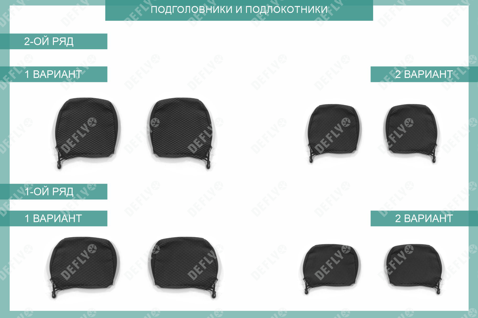Первый ряд: Подголовник переднего кресла – 2 шт Подголовник переднего кресла большой – 2 шт Спинка переднего кресла – 2 шт Сиденье переднего кресла – 2 шт Подлокотник переднего кресла – 1 шт Второй ряд: Подголовник заднего ряда – 2 шт Подголовник заднего ряда большой – 2 шт Спинка дивана заднего ряда – 2 шт Сиденье дивана заднего ряда – 2 шт Подлокотник заднего ряда правый – 1 шт Подлокотник заднего ряда левый – 1 шт Итого: 19 изделий