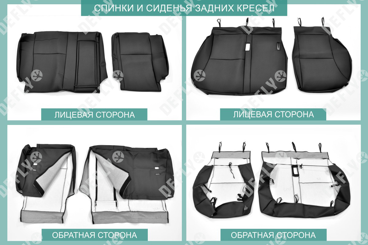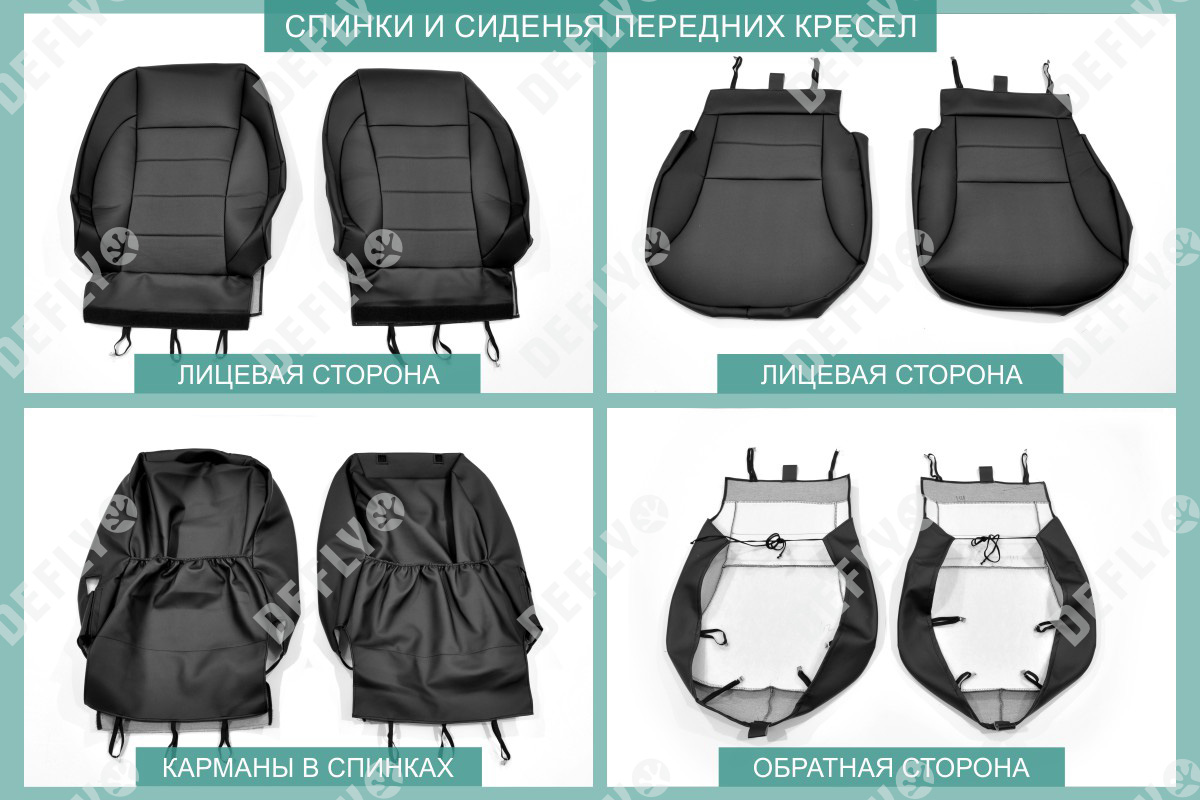 Материал: Экокожа гладкая, экокожа перфорированная, Цвет: Черный (оттенок ткани может незначительно отличаться). Модельные чехлы от производителя “Defly” индивидуально сконструированы для каждого автомобиля. Изготовленные по лекалам оригинальных кресел, чехлы гарантируют идеальную посадку. В комплектацию входят детали всех элементов салона: передних кресел, заднего дивана, третьего ряда сидений, подголовников, подлокотников и т.д. Спинки передних кресел дополнены карманами. Все швы и технологические отверстия обработаны на оверлоке. Чехлы не ограничивают заводскую функциональность салона. Наличие в чехлах специального распускаемого шва не препятствует своевременному и полному раскрытию подушек безопасности. Специально разработанная система креплений позволяет надежно зафиксировать изделия. Авточехлы изготовлены из двух видов экокожи черного цвета: гладкой и перфорированной. Перфорированная экокожа используется в центральных элементах, что обеспечивает циркуляцию воздуха. * Представленные фотографии являются примером исполнения и служат для демонстрации материалов и конструкции чехлов.