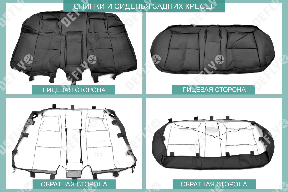 Материал: Экокожа гладкая, экокожа перфорированная, Цвет: Черный (оттенок ткани может незначительно отличаться). Модельные чехлы от производителя “Defly” индивидуально сконструированы для каждого автомобиля. Изготовленные по лекалам оригинальных кресел, чехлы гарантируют идеальную посадку. В комплектацию входят детали всех элементов салона: передних кресел, заднего дивана, третьего ряда сидений, подголовников, подлокотников и т.д. Спинки передних кресел дополнены карманами. Все швы и технологические отверстия обработаны на оверлоке. Чехлы не ограничивают заводскую функциональность салона. Наличие в чехлах специального распускаемого шва не препятствует своевременному и полному раскрытию подушек безопасности. Специально разработанная система креплений позволяет надежно зафиксировать изделия. Авточехлы изготовлены из двух видов экокожи черного цвета: гладкой и перфорированной. Перфорированная экокожа используется в центральных элементах, что обеспечивает циркуляцию воздуха. * Представленные фотографии являются примером исполнения и служат для демонстрации материалов и конструкции чехлов.